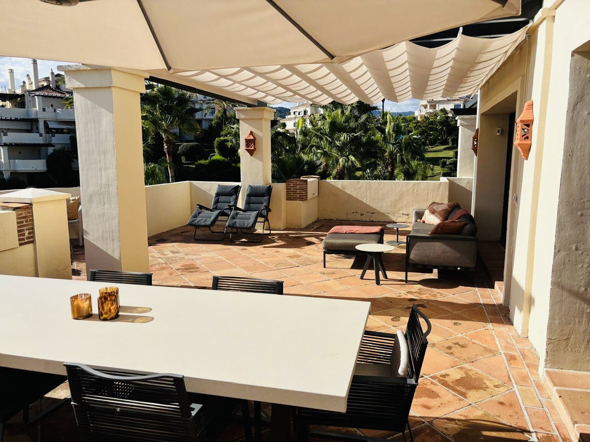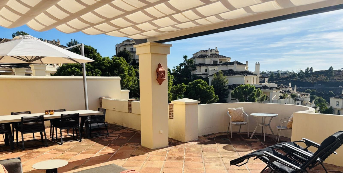 The penthouse is full of light and space with a huge terrace of 106m2. The terrace has beautiful views of the urbanisations luxury gardens with a mountain backdrop.