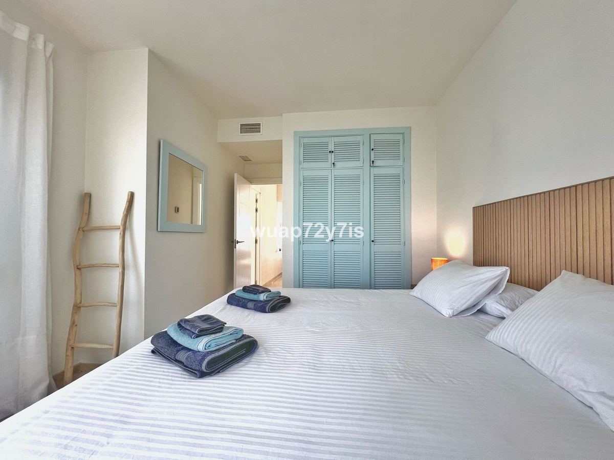 The property features two bedrooms sharing a bathroom, as well as a master bedroom with an en-suite bathroom. Parking is available within the gated urbanisation. The beach is just a 3-minute walk away.