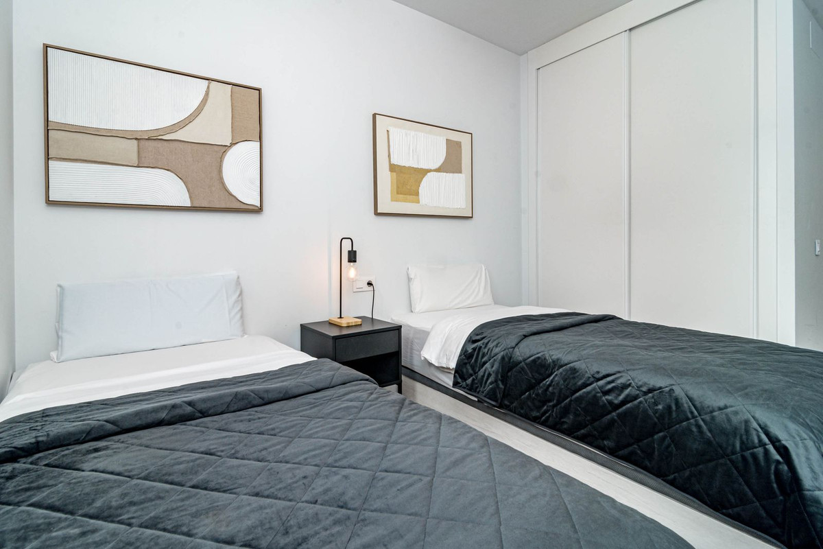 Estepona Gardens was developed by one of Spain's largest builders and offers excellent communal facilities, including a swimming pool and a children's play area. The apartment is ideal both as a permanent home or as a lock-up-and-leave holiday property, thanks to its central location, easy maintenance, and an active, valid tourist license. Inside, you'll find a separate kitchen and an adjoining utility room with a washing machine and water heater. The bedrooms feature built-in wardrobes, and the interiors are finished with light, high-quality materials.