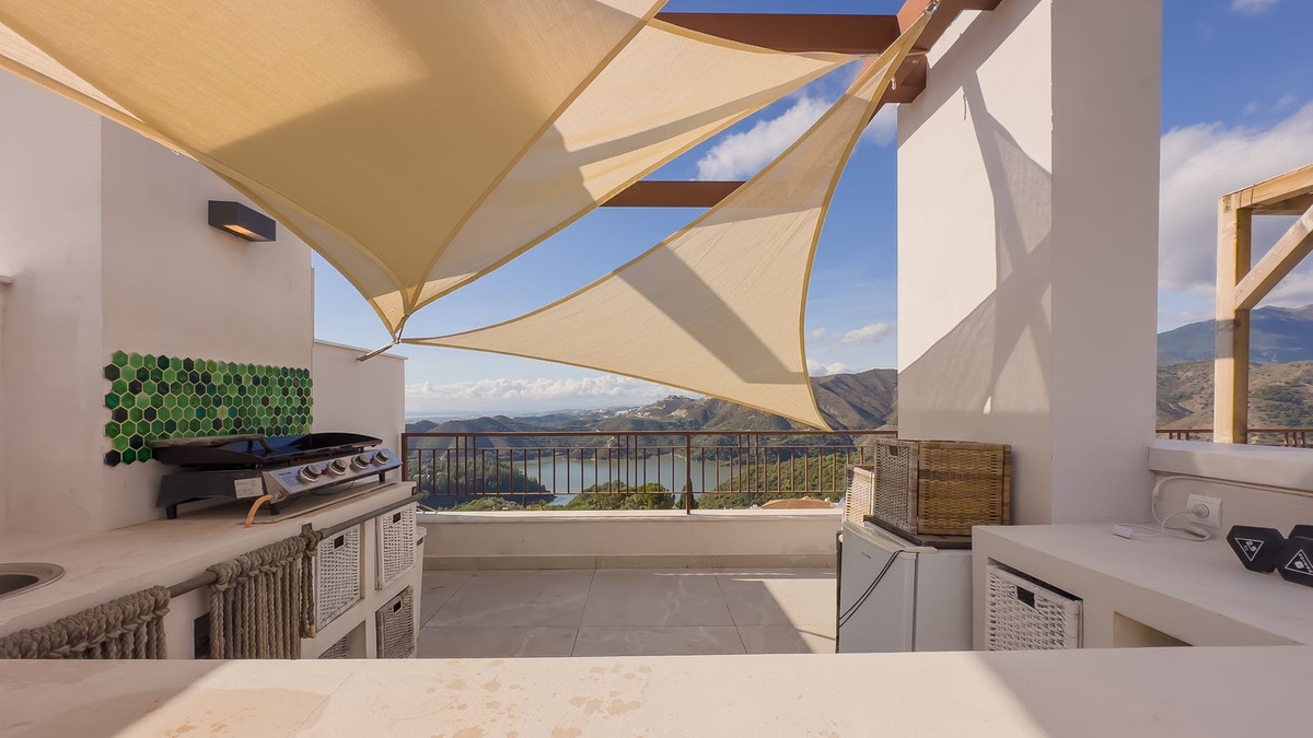 Priced at €1150000 : Exclusive Corner Penthouse with Rooftop Terrace and Panoramic Views over Istán and Marbella Set on a privileged corner position high above the picturesque Istán reservoir, this exceptional corner penthouse offers an elevated lifestyle where luxury, nature and breathtaking views come together in perfect harmony. Surrounded by tranquility and greenery, yet just minutes from Marbella's vibrant lifestyle, this property is truly one of a kind. The penthouse is fully furnished with a stylish and sophisticated interior, combining elegant design with maximum comfort. Thanks to its corner orientation and expansive floor-to-ceiling windows, the property benefits from abundant natural light and an open, airy atmosphere, with spectacular views from almost every angle. The generous terraces are beautifully designed and adorned with striking cacti, creating an exclusive Mediterranean ambiance. From here, the views stretch across the shimmering Istán lake, the Mediterranean Sea, and on clear days reach as far as Gibraltar and the coastline of Morocco. A true highlight of this residence is the private rooftop terrace, perfectly created for outdoor living and entertaining. It features a fully equipped outdoor kitchen, a spacious dining table for eight guests, a sun cover for shade, and a luxurious jacuzzi, offering the ultimate setting to relax while enjoying unforgettable sunsets over the sea. The property also includes a double garage and a separate storage room, ensuring practicality without compromising on luxury. Despite its serene location, the glamorous marina, designer boutiques and fine dining of Puerto Banús are just a seven-minute drive away. An extraordinary corner penthouse for the discerning buyer seeking privacy, panoramic views and refined living on the Costa del Sol.