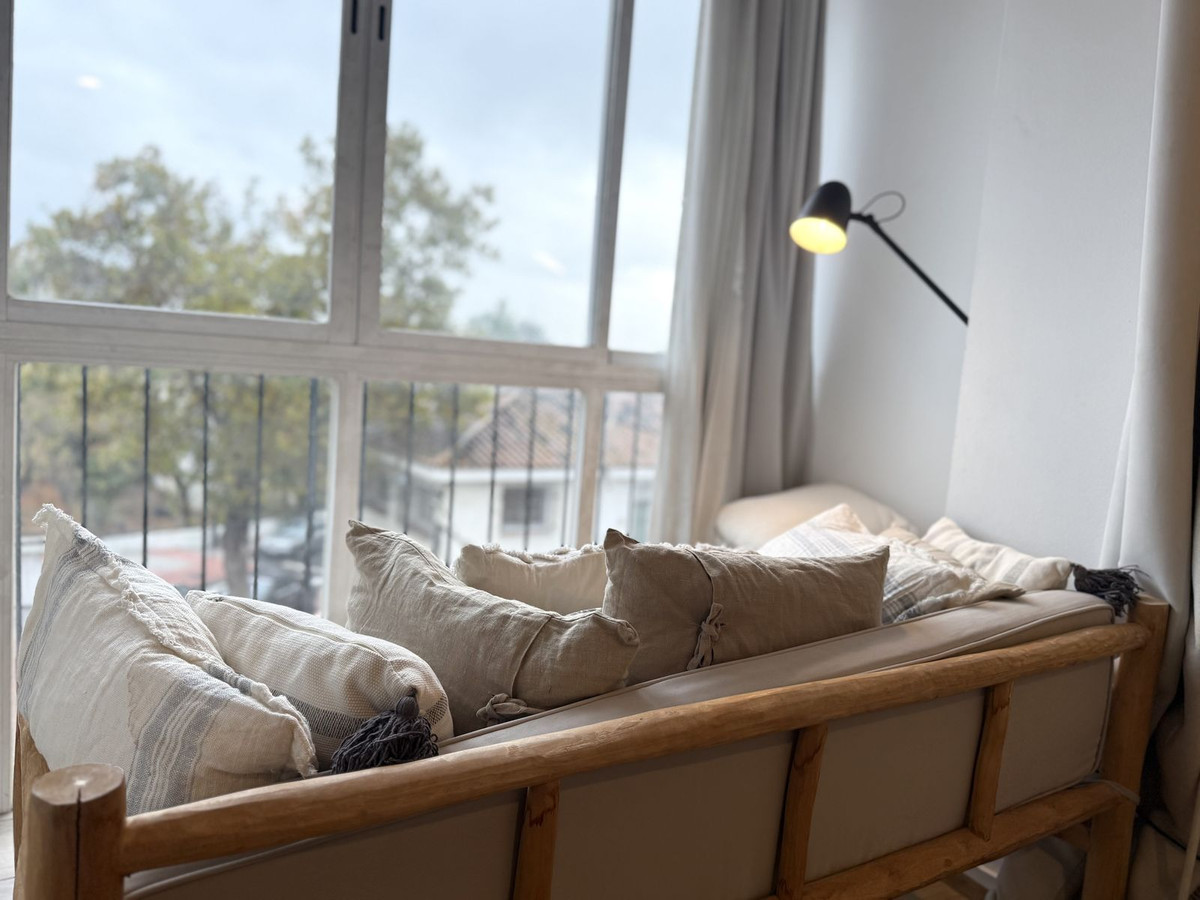 The kitchen is fully equipped in neutral tones, matching the bohemian style that flows throughout the home.