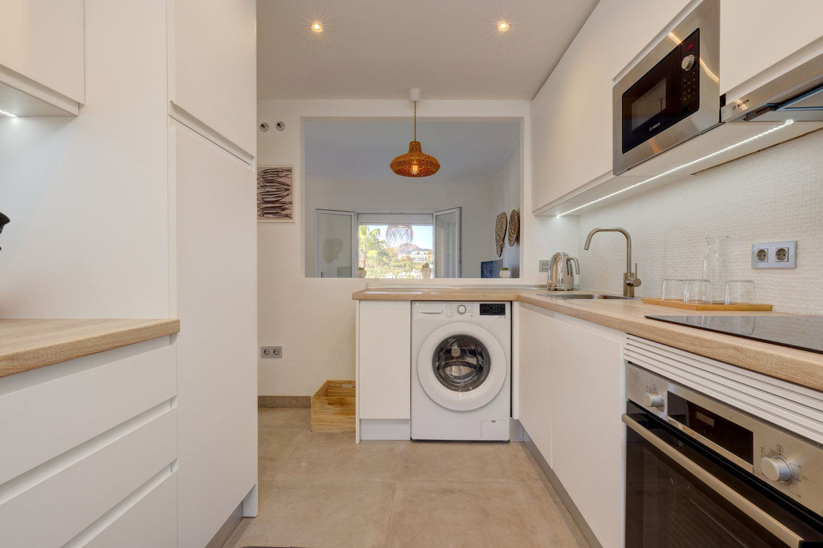 Upstairs there are 2 full bedrooms and a smaller 3rd bedroom and a full shared bathroom. The main bedroom has it´s own private terrace and sea and golf views.