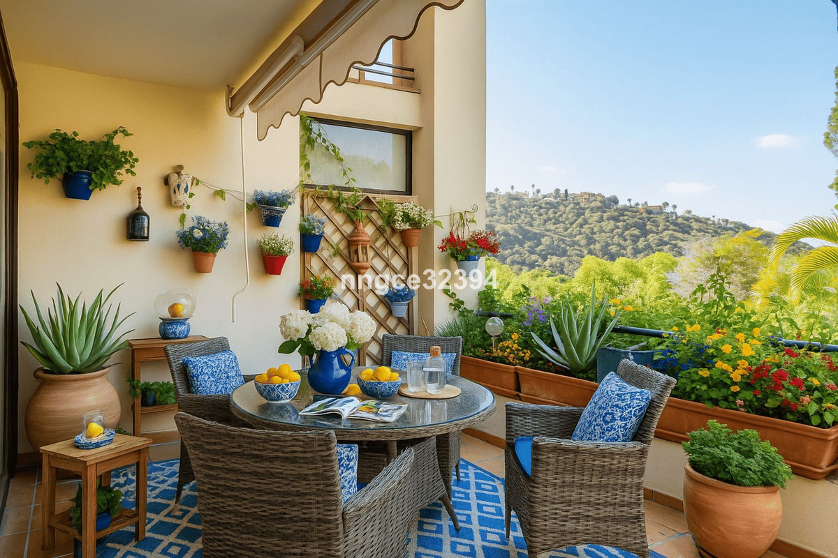The master suite is a serene retreat, complete with an elegant marble en-suite bathroom featuring a luxurious bathtub and direct access to a private terrace. Both bedrooms and the living room open wide to invite gentle breezes, warm Spanish sunshine, and views of pine trees, palm fronds, and lush gardens. This romantic home is filled with light and love, with nature gracefully surrounding every corner.