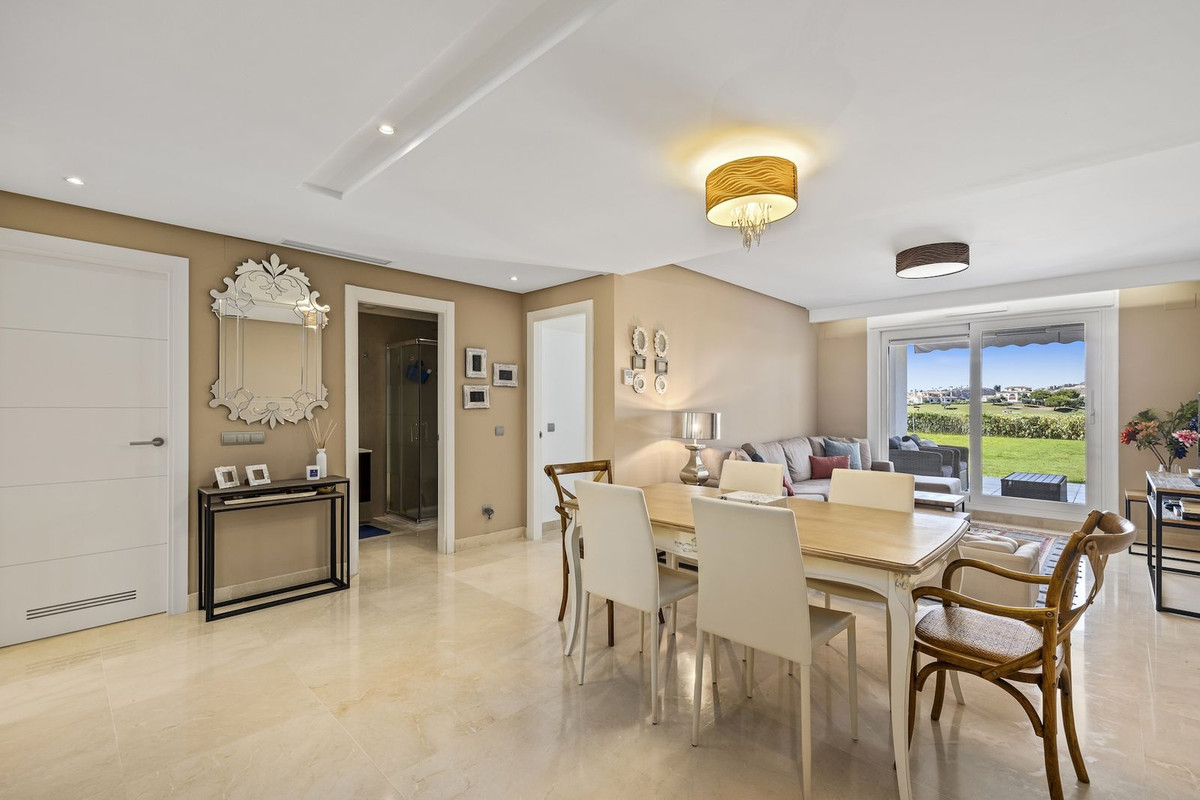 This 3-bedroom, 2-bathroom ground floor apartment is a spacious, tranquil retreat with impeccable interiors, high-end finishes, air conditioning, cream marble floors and a designer kitchen. The highlight of this home is its large private terrace of 48 m2, which opens to a magnificent garden space for private use . Here, you can enjoy with great privacy the stunning open views of the golf course and the sunsets that make this property something truly special. The apartment is sold with part of the furniture.