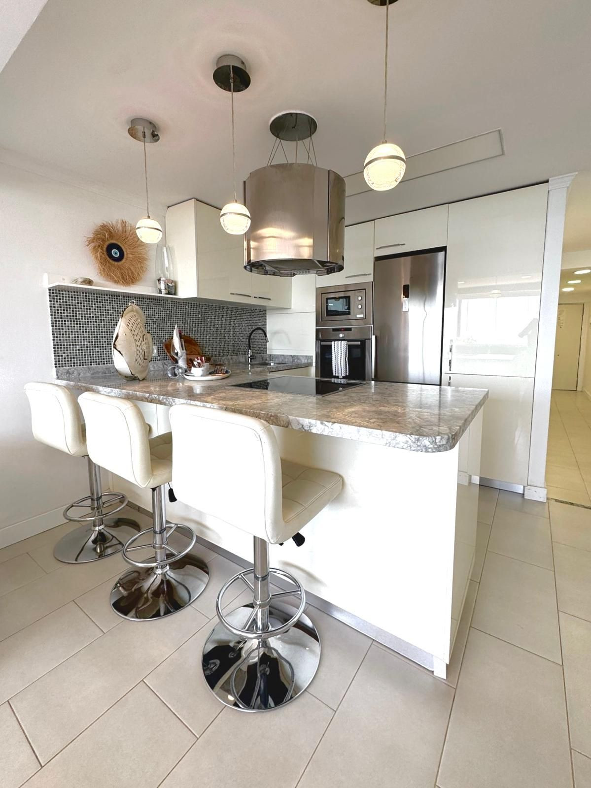 With panoramic sea views from the living room, this beautifully renovated apartment features a master suite bedroom, an additional full bathroom, and an inviting living area with sofa beds. The open American kitchen blends seamlessly into the space, ideal for relaxed mornings or entertaining friends. The flat is fully equipped with modern conveniences, including not only a washing machine but also a dryer.
