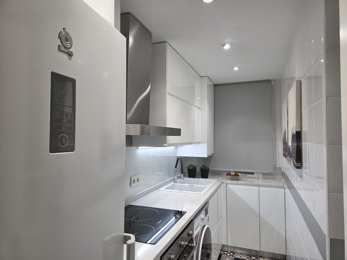 MARBELLA CENTER!!! Recently renovated apartment with a beautiful and spacious entrance hall leading to the welcoming living room, which opens onto one of the apartment's terraces. The kitchen features high-quality designer cabinetry and top-brand appliances. There are two bedrooms, one with a private terrace separate from the other, and an elegant and practical bathroom with a shower and screen. The apartment is located next to the beach, right on Marbella's seafront promenade, and just 2 minutes from the old town. On the top floor of the building, there is a rooftop terrace for drying laundry, if needed, and a private storage room belonging to the owner. Oh, and I almost forgot, the apartment has air conditioning (heating and cooling).