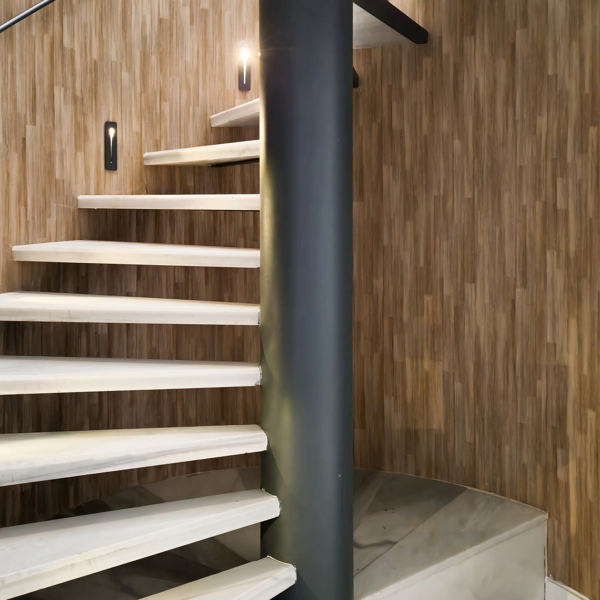 A modern staircase takes us to the second floor, where there is another bedroom, a full bathroom, a wardrobe area, and a large master bedroom with a dressing area and a full bathroom, all with access to the large terrace with views.
