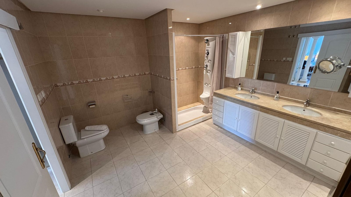 Priced at €875000 : Suitable for a movie star, this three bedroom tastefully decorated apartment has been designed by the builder of this gated complex with three bedroom with plenty of living space. The property comprises: Entrance hall with guest cloakroom leading to an enormous lounge with dining area leading onto the terrace, very spacious fully fitted luxury kitchen, main bedroom suite with access to the terrace, fitted dressing area leading to a sumptuous bathroom with all round shower jets, jacuzzi bath and a purpose built sauna, two further double bedrooms both with en-suite bathrooms and guest toilet. Communal swimming pool for the use of this apartment and only four others.