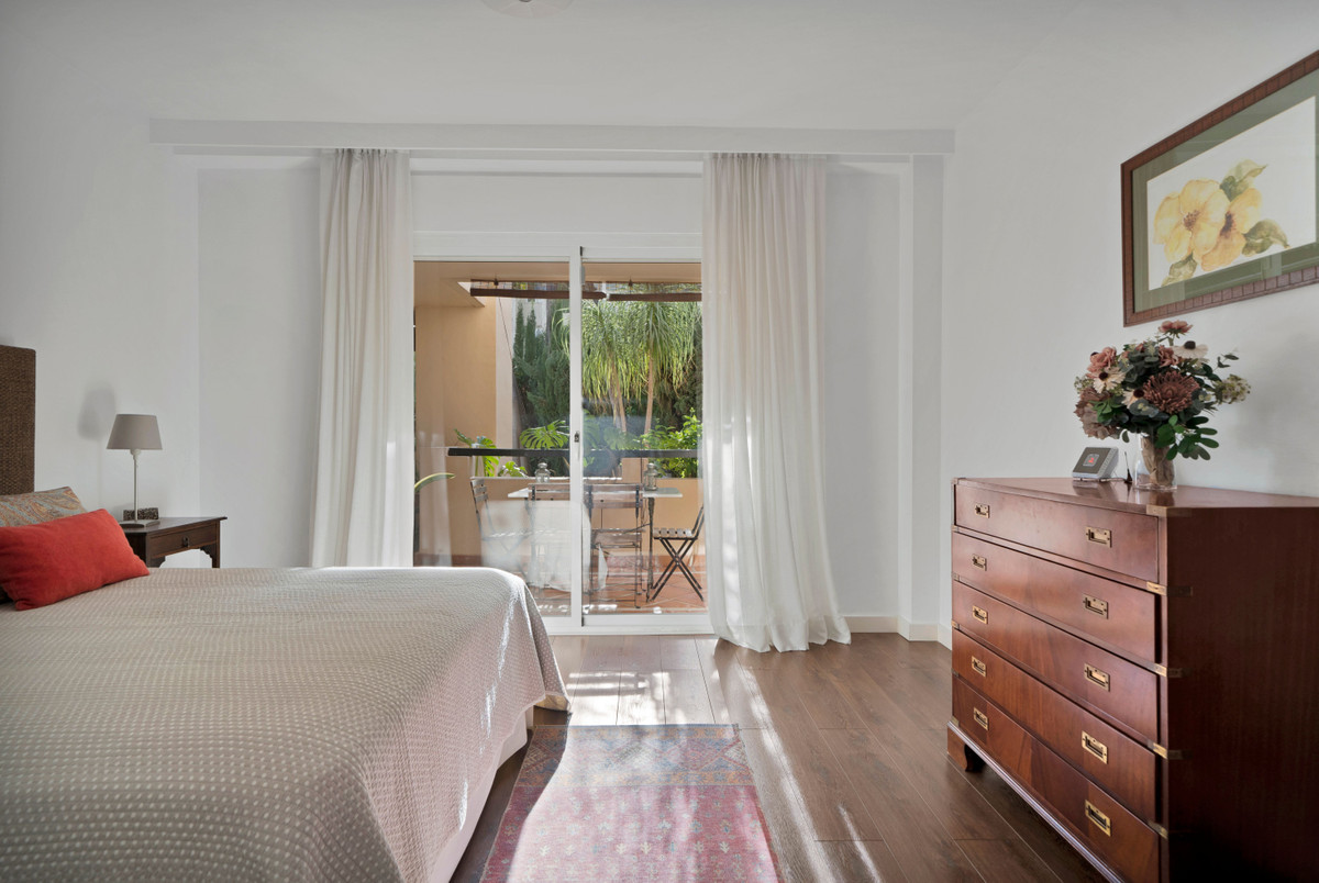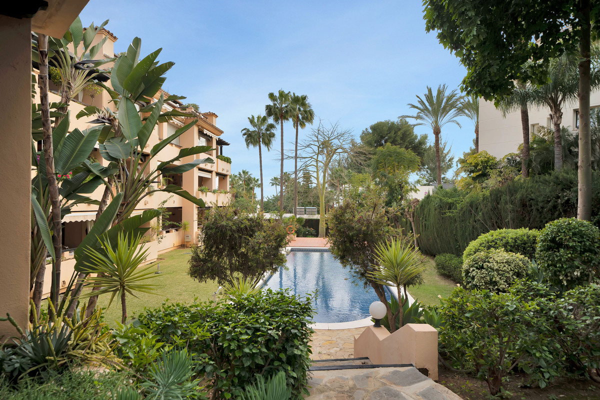 This elegant ground-floor apartment is located in a prestigious gated community in Nagüeles, just 6 minutes walking from The British International School of Marbella and 5 minutes from the beach.