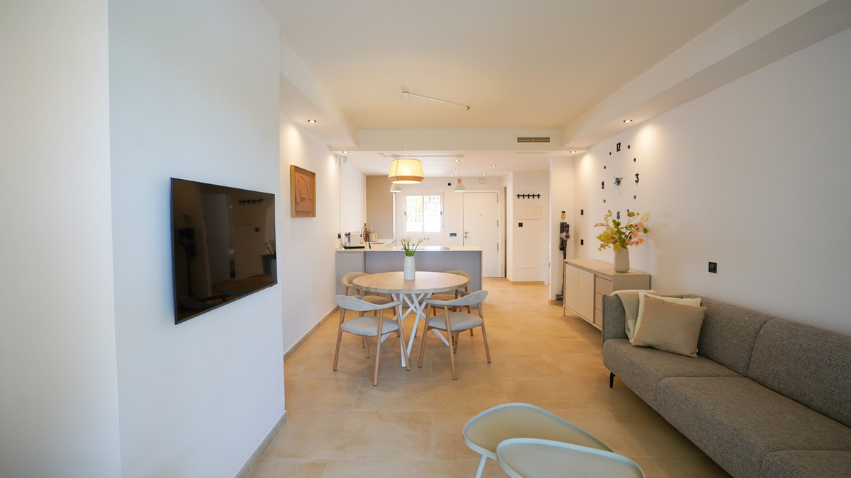 The apartment features two spacious bedrooms and two sleek, modern bathrooms, all recently refurbished to the highest standards. The open-plan living and dining area flows effortlessly onto a private covered terrace with serene garden and pool views—ideal for alfresco dining or relaxing in the sun. High-quality double glazing, air conditioning, and a modern alarm system ensure year-round comfort and security, while fitted wardrobes offer generous storage.