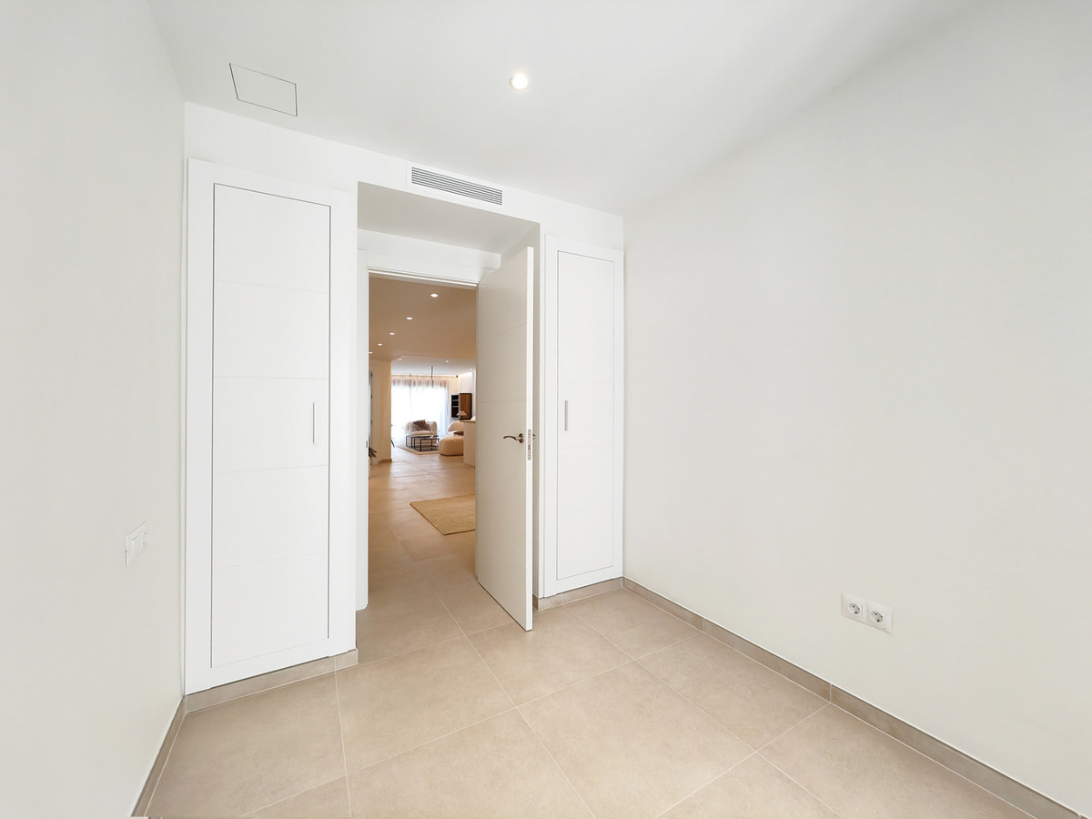 Ground Floor Apartment for sale in La Maestranza, Marbella with 3 bedrooms, 2 bathrooms and with orientation east, with communal swimming pool, private garage (1 parking spaces) and communal garden. Regarding property dimensions, it has 121 m² built. Has the following facilities amenities near, transport near, air conditioning, fully fitted kitchen, utility room, guest room, alarm, security entrance, brand new, security service 24h, guest toilet, private terrace, living room, country view, mountain view, heated pool, security shutters, laundry room, internet – wi-fi, electric blinds, fitted wardrobes, gated community, lift, street view, close to children playground, close to sea / beach, close to golf, open plan kitchen, wheelchair-accessible, ceiling heating system, close to shops, close to town, close to port, close to schools and surveillance cameras.