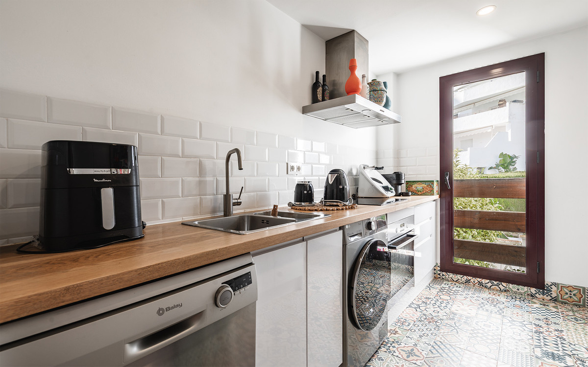 This exquisitely three-bedroom apartment is ideally located in the heart of Nueva Andalucía, within easy reach of all amenities and just minutes from the beach. Situated on the first floor of a charming gated community, the property combines contemporary comfort with the timeless appeal of Andalusian-style living.
