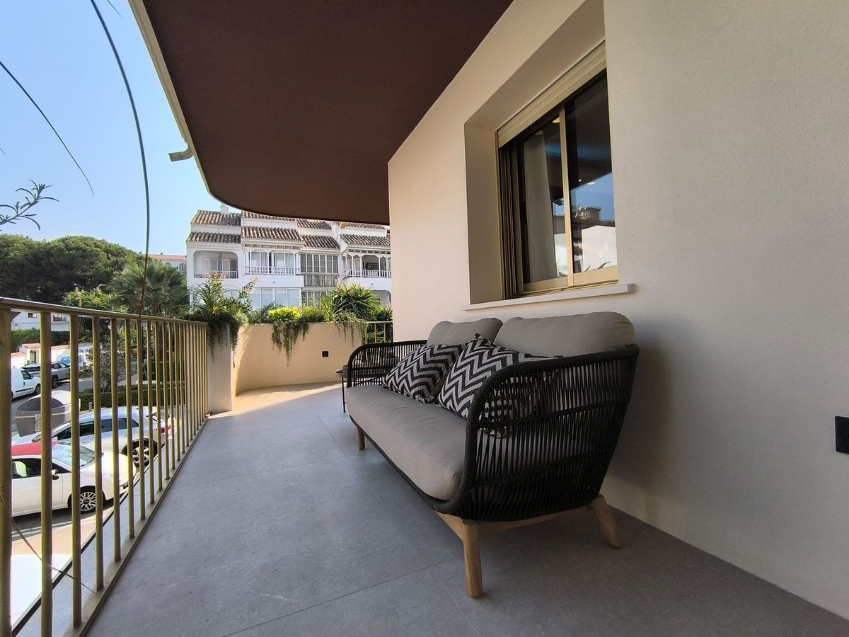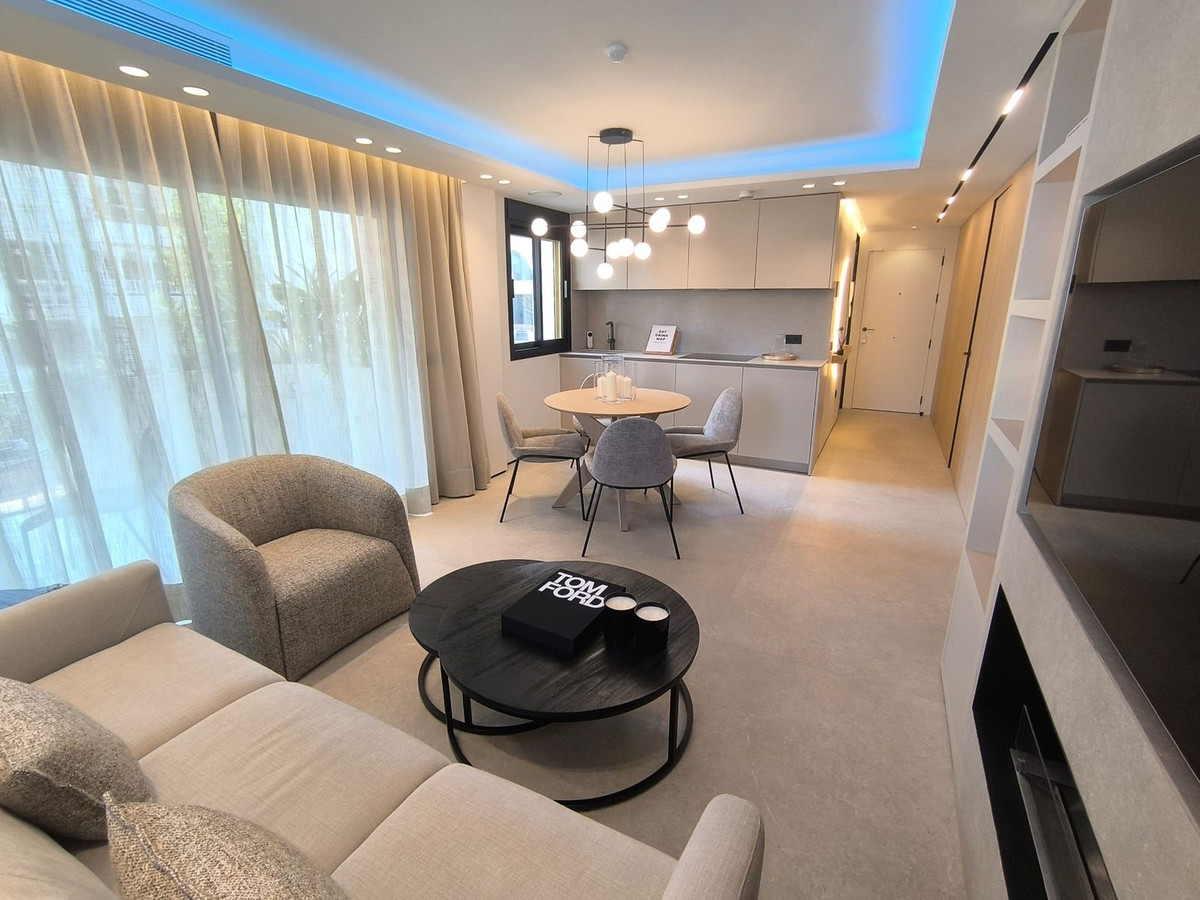 Modern apartment with 2 bedrooms and 2 bathrooms located in the best area of Puerto Banus. Large entrance hall that leads to the different areas of the apartment. Fully equipped and furnished independent kitchen with integrated breakfast area hidden in the wood paneling. Top quality materials from the Logos brand. Miele brand appliances, with integrated ceramic hob in the countertop. Bright living room with bioethanol fireplace with integrated LG TV and access to open terrace with views.