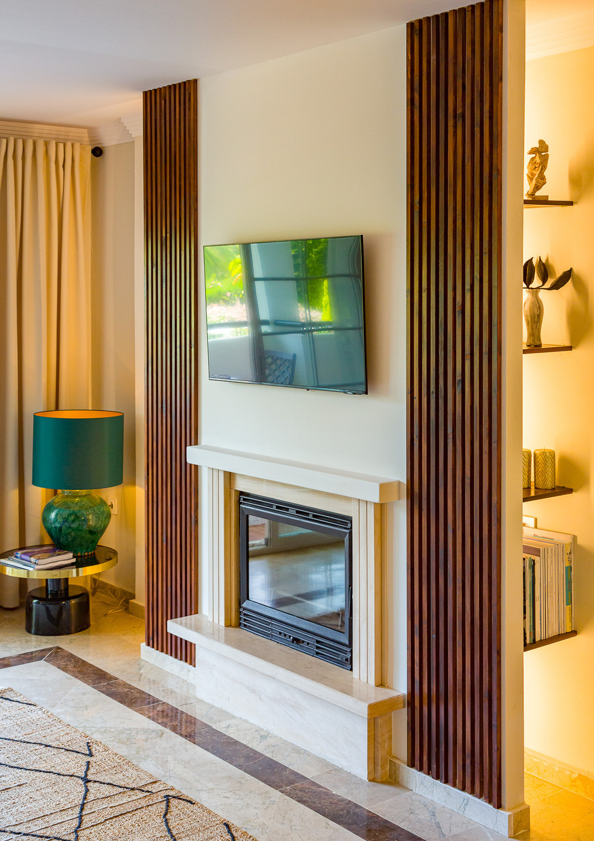 Living room spacious, comfortable sitting area (or to lie down), HD TV wall composed with fireplace decorated with hidden LED lighting.