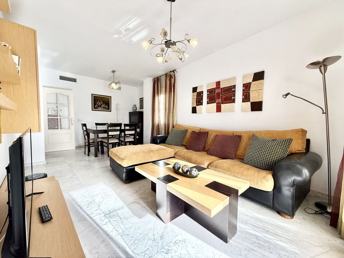 The property features a spacious living and dining area. From the living room, there is direct access to a south-facing terrace overlooking the communal gardens. On this same level, there are two generous bedrooms with built-in wardrobes and two full bathrooms, one of which is en-suite in the master bedroom. The property also includes a fully equipped kitchen with a separate utility room.
