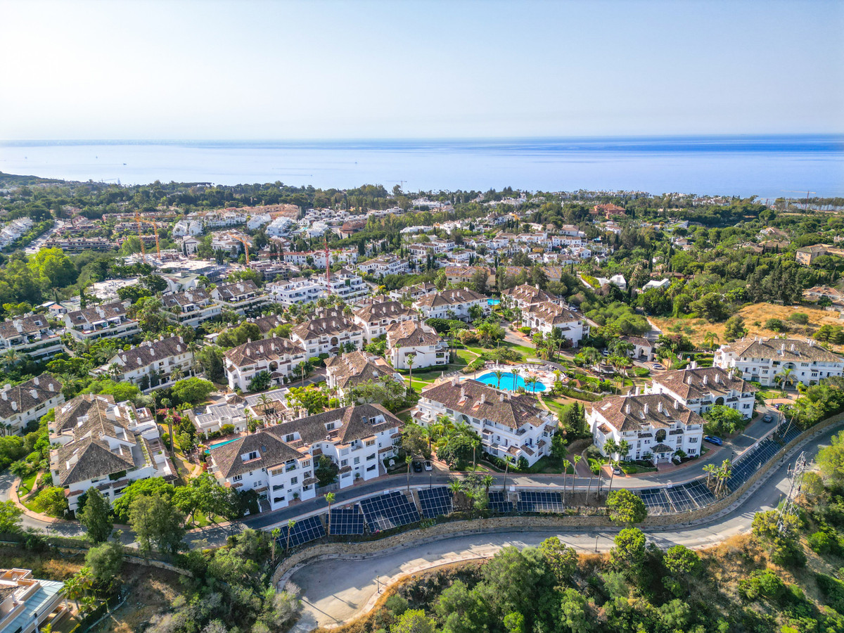 Wonderful three bedroom, south east facing duplex penthouse in the exclusive and gated community of Monte Paraiso on the Golden Mile, with 24hr security, several outdoor swimming pools, a bar/restaurant, children's play area, fully equipped gym, steam room, sauna, squash court, massage room, indoor heated swimming pool and tropical gardens that are maintained to the highest standards. As well as all this it is only a short walk to the famous Puente Romano Hotel and the beach. The main level of the property has a large living and dining area with patio doors leading out to the spacious terrace with amazing sea views; a fully fitted kitchen with separate utility room; two guest bedrooms, one with a private terrace with stunning views to La Concha mountain; and a guest bathroom. The upper level leads to the master suite with vaulted ceilings, a Jacuzzi bath and access to a private terrace with spectacular sea views. Other features include marble floors, fireplace, fitted wardrobes, hot and cold air conditioning, two private parking spaces and a storage room.