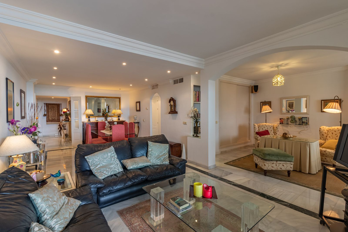 Each of the 3 bedrooms also has its own private terrace with blinds. The interior boasts white marble flooring, lacquered white woodwork and built-in furniture, and cream marble bathrooms. Sold fully furnished, this duplex also includes a garage and storage room.