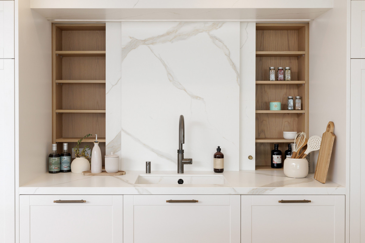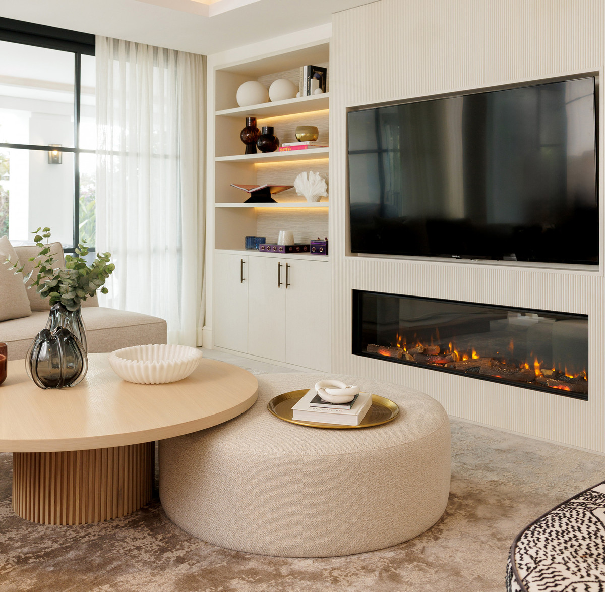 The kitchen is a key highlight of the property. Designed with clean lines and premium materials, it includes a large central island, built-in appliances, and abundant storage concealed within tailored cabinetry. The layout encourages interaction, with direct views toward the living room and seamless access to the exterior terraces and pool. This combination of layout and design makes the main floor one of the home's strongest assets.