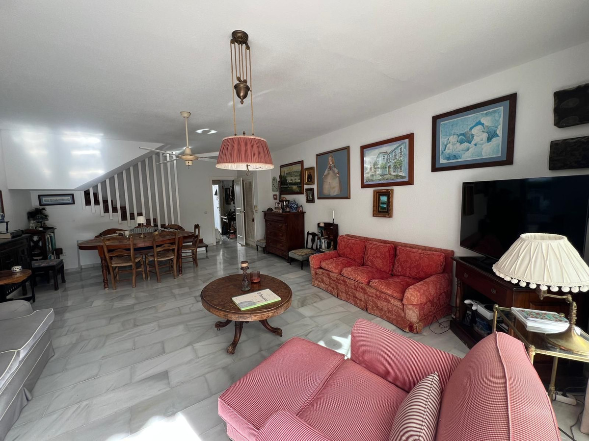 Nestled in the heart of Marbella's prestigious Golden Mile in Nagüeles, this charming townhouse offers a serene residential escape just 5 minutes from the iconic Puente Romano hotel beach and moments from Sierra Blanca. Surrounded by a peaceful, family-friendly neighborhood adjacent to a vast park filled with pines, eucalyptus, mimosas, and more – perfect for leisurely walks with children or pets – this 170 m² property combines luxury, privacy, and natural beauty in an unbeatable location. Convenient communal parking with plenty of spaces is just in front of the entrance, adding to the ease of daily life.