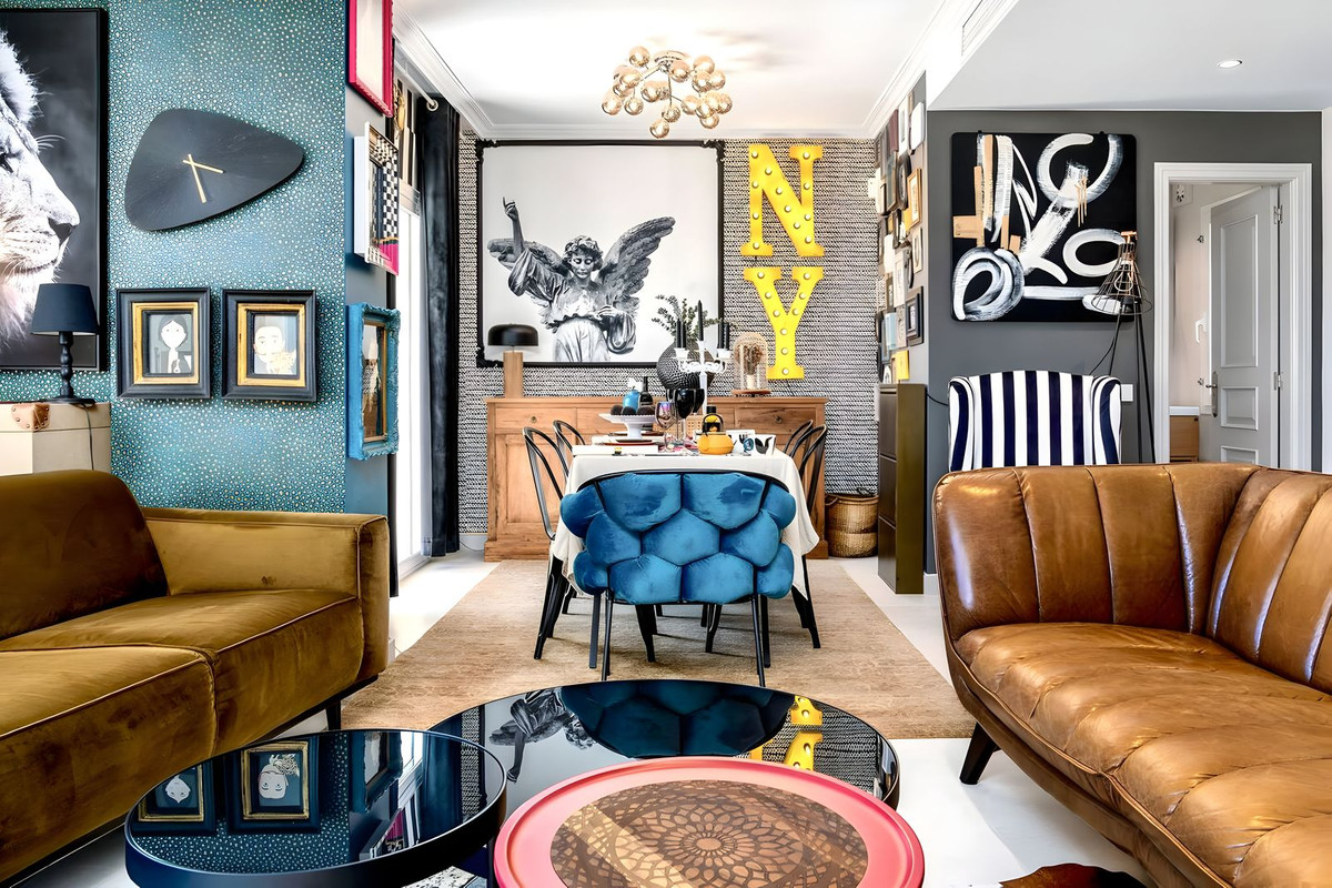 a unique interior design. This three-floor property offers an open-plan kitchen with Siemens