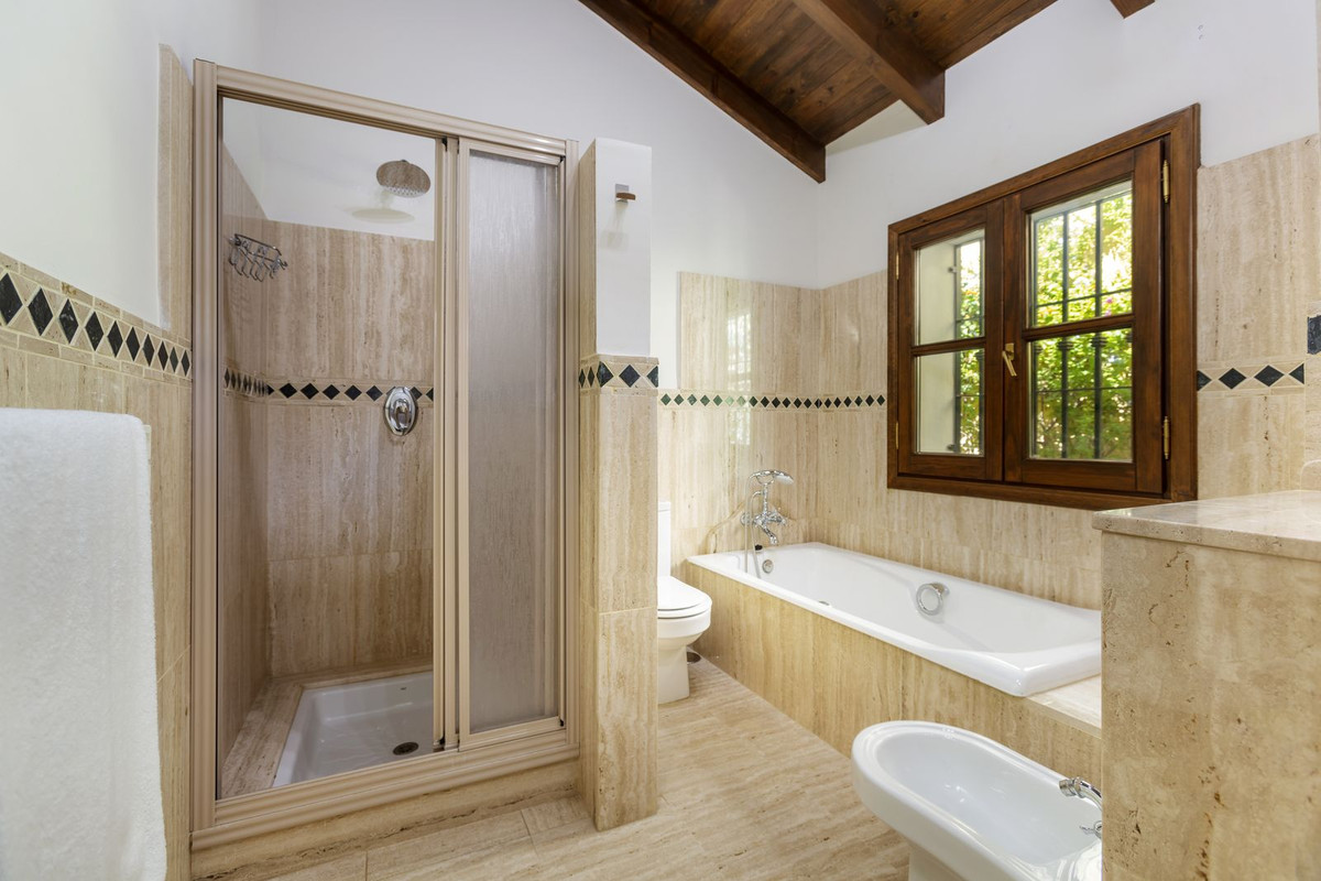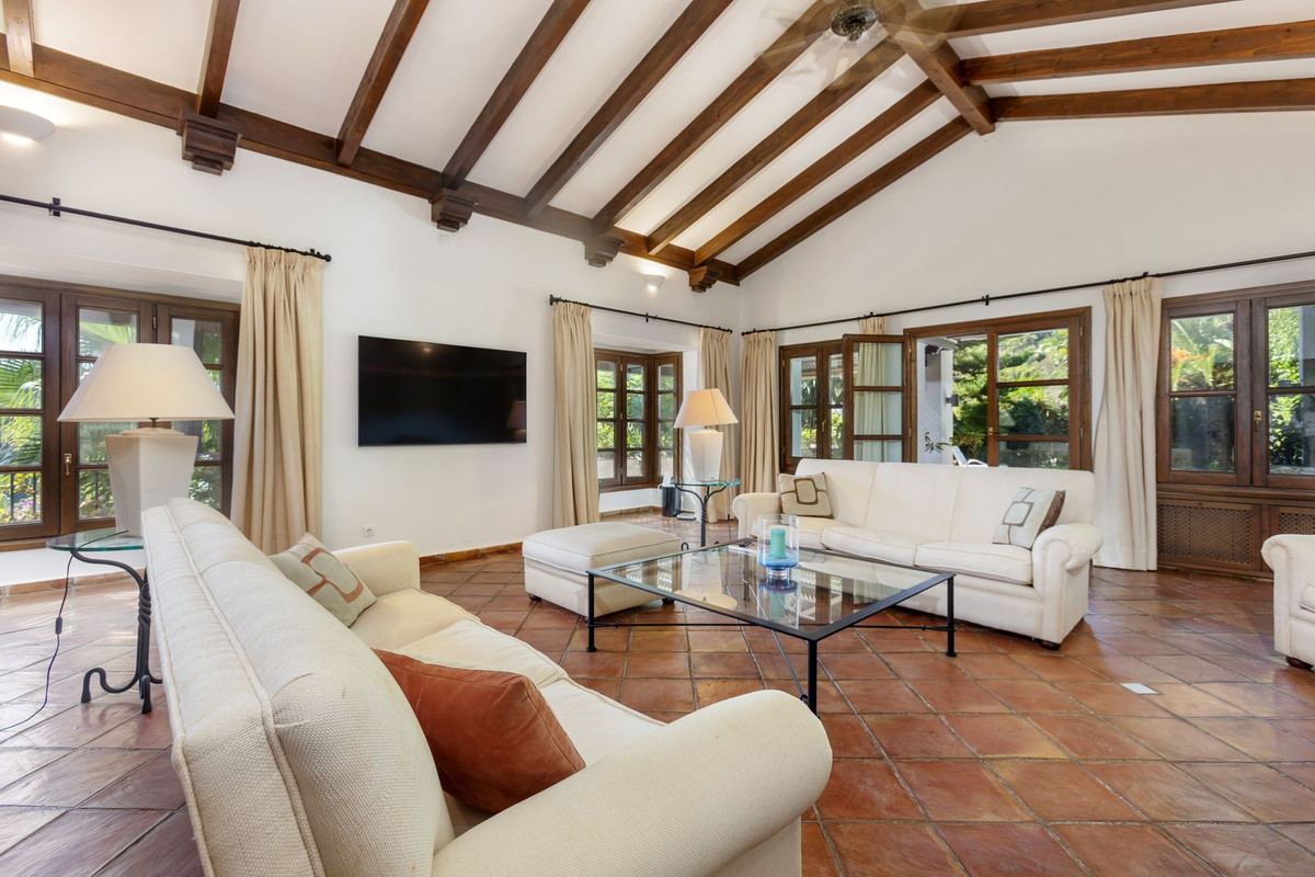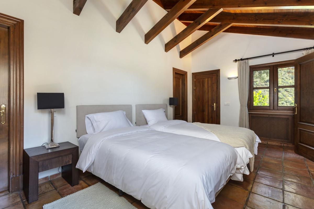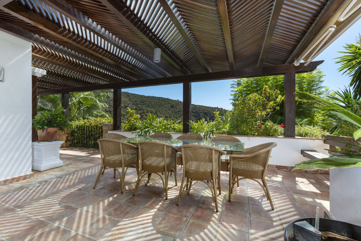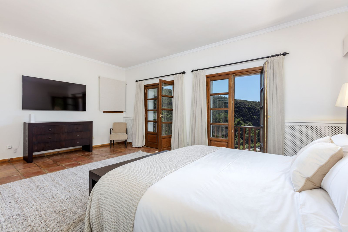 Electric gates lead you into the driveway which has parking for several cars and also a double garage. There is a utility room plus large kitchen that opens up into the breakfast room. huge dining room which leads into the impressive sitting room with high beamed ceilings and cosy fireplace – perfect for winter evenings. Opening up from the sitting room is a huge terrace and garden area with large pool which is heated – Ideal for all lovers of swimming on a winters day! The garden offers total privacy and total panoramic views accross the valley and village and to the protected forest areas and super exclusive La Zagaleta.