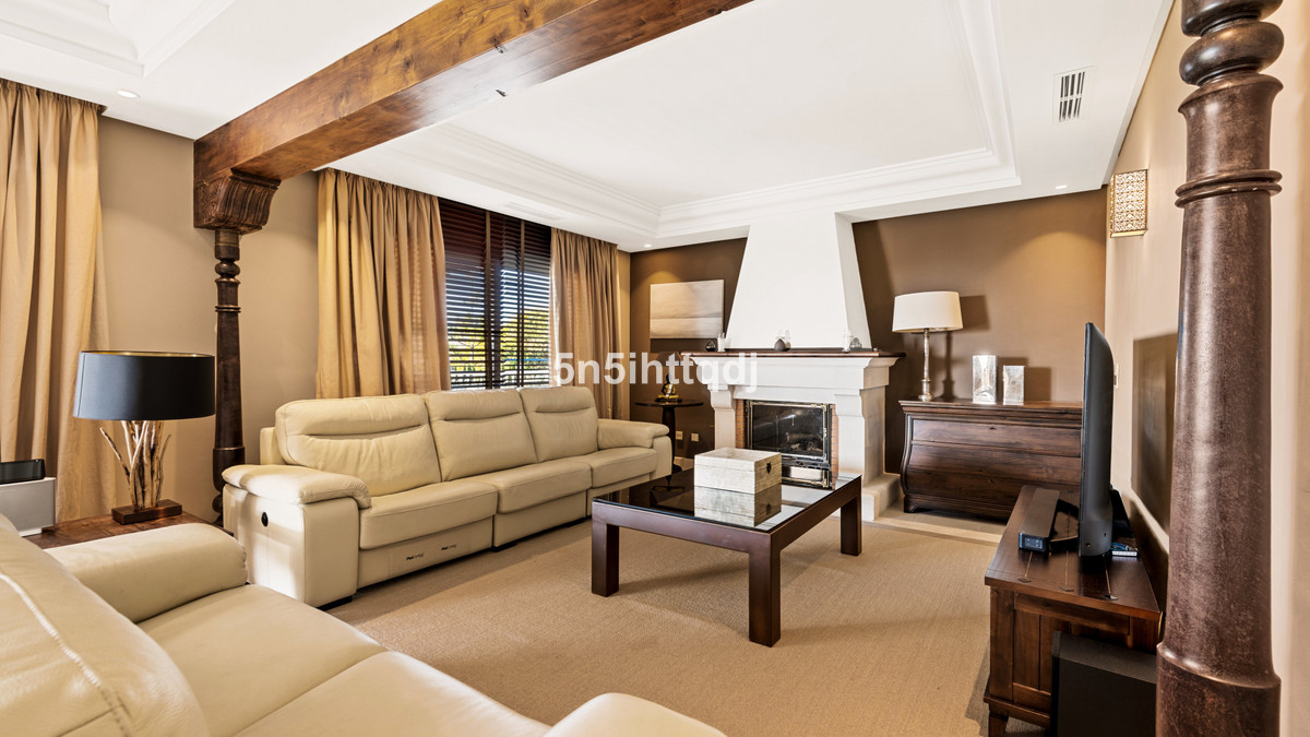This classic-style, five-bedroom villa features a spacious entrance hall leading to an open-plan kitchen with a central island. The kitchen opens directly to the garden, extending the living space outdoors. Adjacent to the kitchen is the dining room and the main lounge, which includes a working fireplace. The ground floor also includes a guest bedroom suite and a convenient cloakroom.