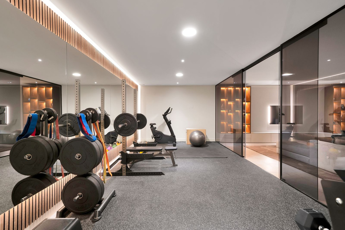 The lower level is dedicated to entertainment and well-being, featuring a fifth en-suite bedroom with a walk-in closet, a gym, sauna, entertainment room, guest toilet, laundry room, and multiple storage spaces. A charming Spanish patio floods this floor with daylight, enhancing its warmth and inviting atmosphere.