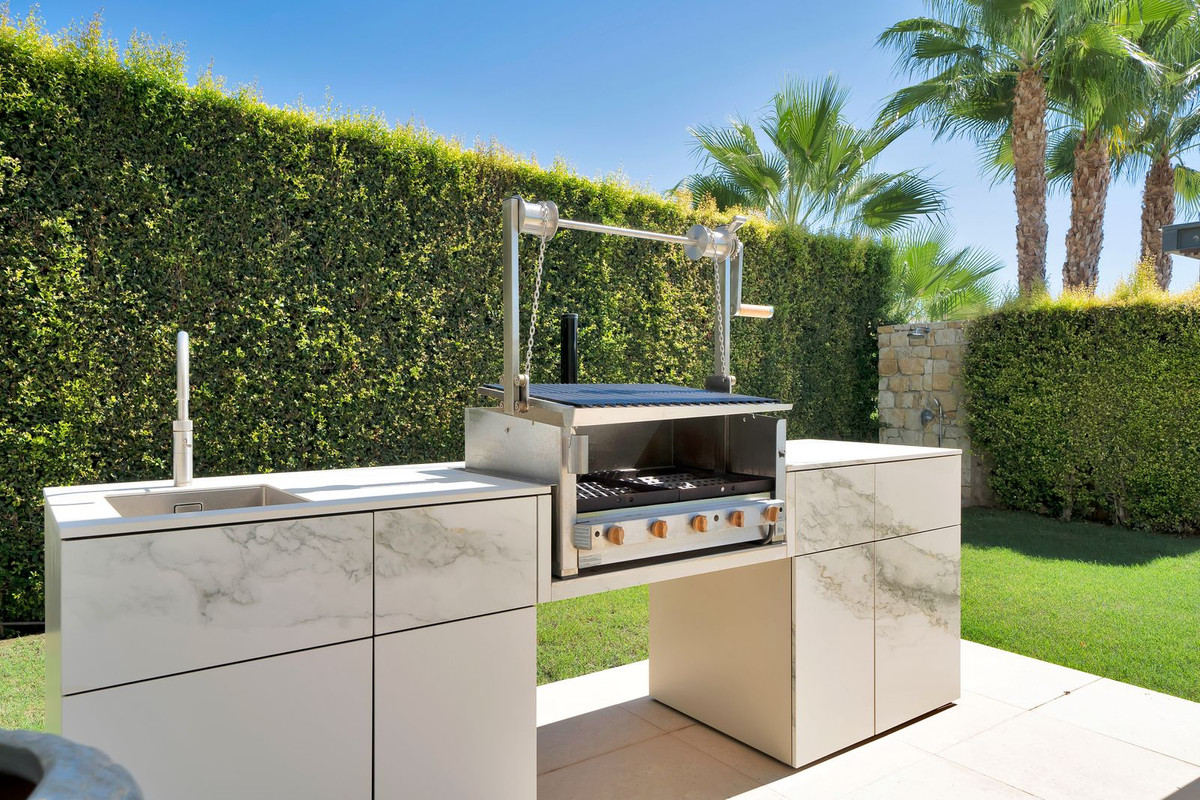 Outdoors, a fully equipped summer kitchen with a charcoal grill sets the stage for unforgettable alfresco dining experiences. A covered dining and lounge area, as well as an additional shaded terrace by the infinity pool, provide multiple spaces to unwind and enjoy the serene surroundings. Sun loungers line the pool, inviting you to relax in total tranquility.