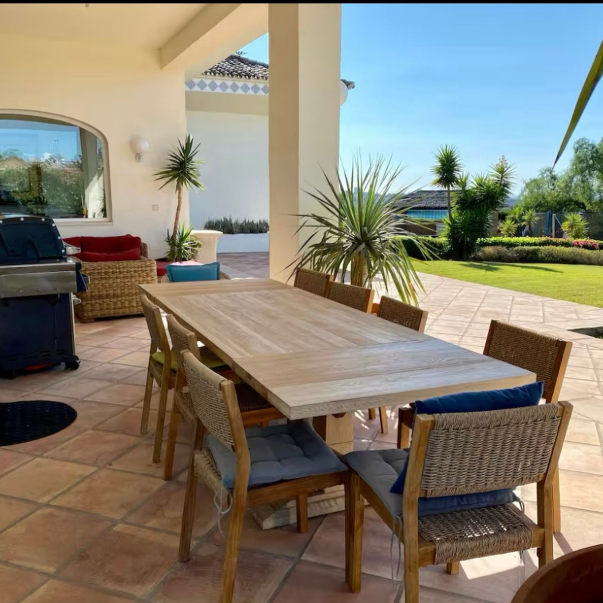The outdoor areas are designed for leisure and entertaining, with a private swimming pool, seasonal jacuzzi (on request), extensive terraces, BBQ area, lush Mediterranean gardens, and private parking for up to 10 vehicles.