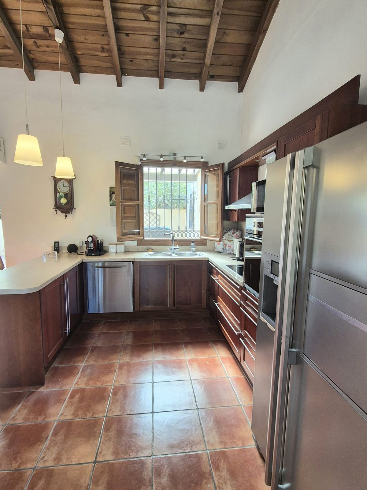 As you enter the property through the electric gates you have a stoned road that leads to the finca, with ample car parking, 2 car carport / garage, at the front of the property there is a nice covered terrace to enjoy alfresco dining. Entering the finca into the open living room / kitchen, you have high ceilings with wood beams, the kitchen is fully fitted and in prestine condition, and the living room has a wood burner and pellet stove. From here is also access to the back part of the house where there is a nice courtyard and you can combine being outside and in as well. From the living room you have a hallway that leads you to the 2nd double bedroom, guest full bathroom and large master suite with a big ensuite bathroom, this is a huge room with lots of potential for making it even into 2 bedrooms, you have skylights, a window and door that accesses the same back courtyard, nice fitted wardrobes. The master bathroom has a large soaker tub and free standing separate shower.