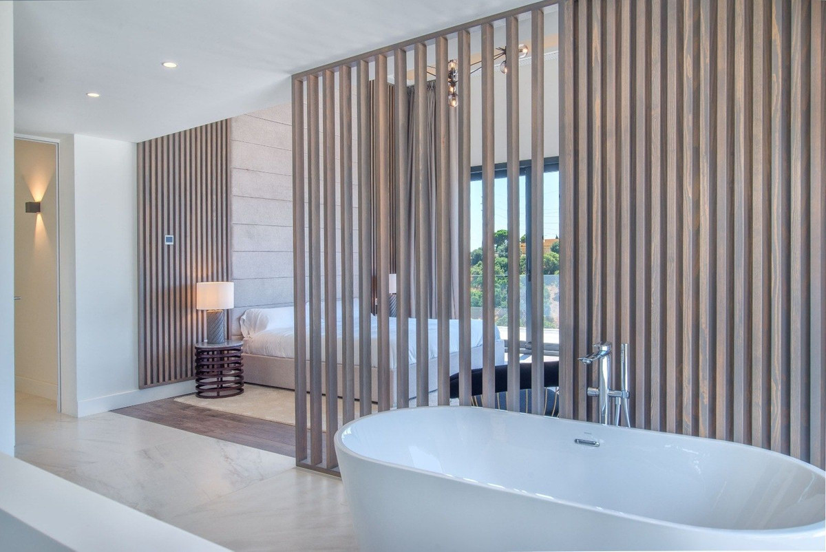 The master bedroom on the first floor has a vaulted ceiling and "open plan" en suite bathroom and walk in wardrobe with patio doors to the terrace.