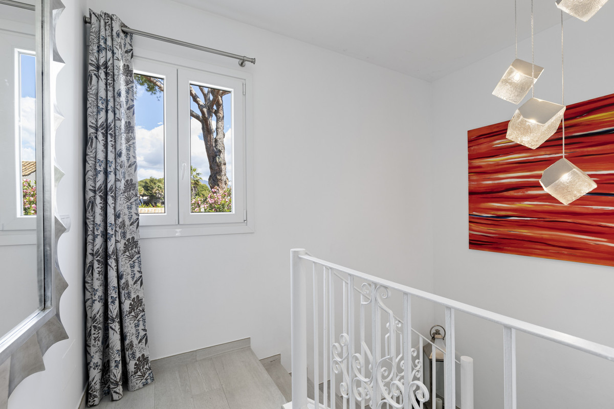 Priced at €665000 : Tucked away amongst the beautiful umbrella pines, this tastefully updated home offers an enviable lifestyle, just a six minute walk from the beach. Inside, this beautiful detached home features three well-appointed bedrooms, two sleek contemporary bathrooms and pretty juliette balconies with top of the pine tree views. Designed for comfort and style, the open-plan layout brings together clean lines and a welcoming atmosphere—ideal for everyday living, vacation escapes, or rental income potential. Modern efficiency is built in, with underfloor heating covering the entire ground level and upstairs bathrooms, all powered by a smart solar-heated water system. Outside, a spacious private garden and shaded terrace invite both relaxation and entertaining. The property also includes off-street parking. A unique chance to own a stylish retreat in one of the most desirable coastal areas.