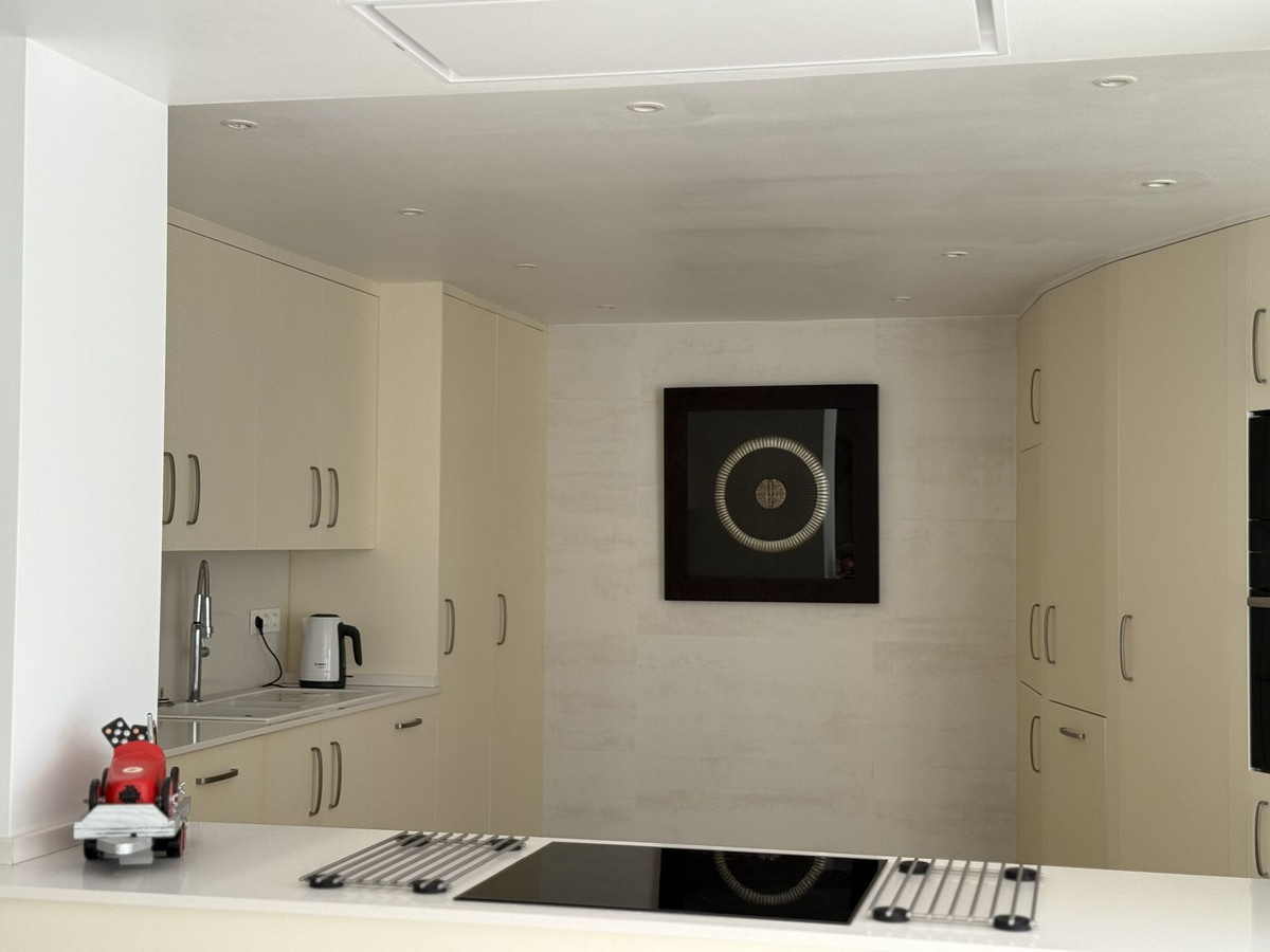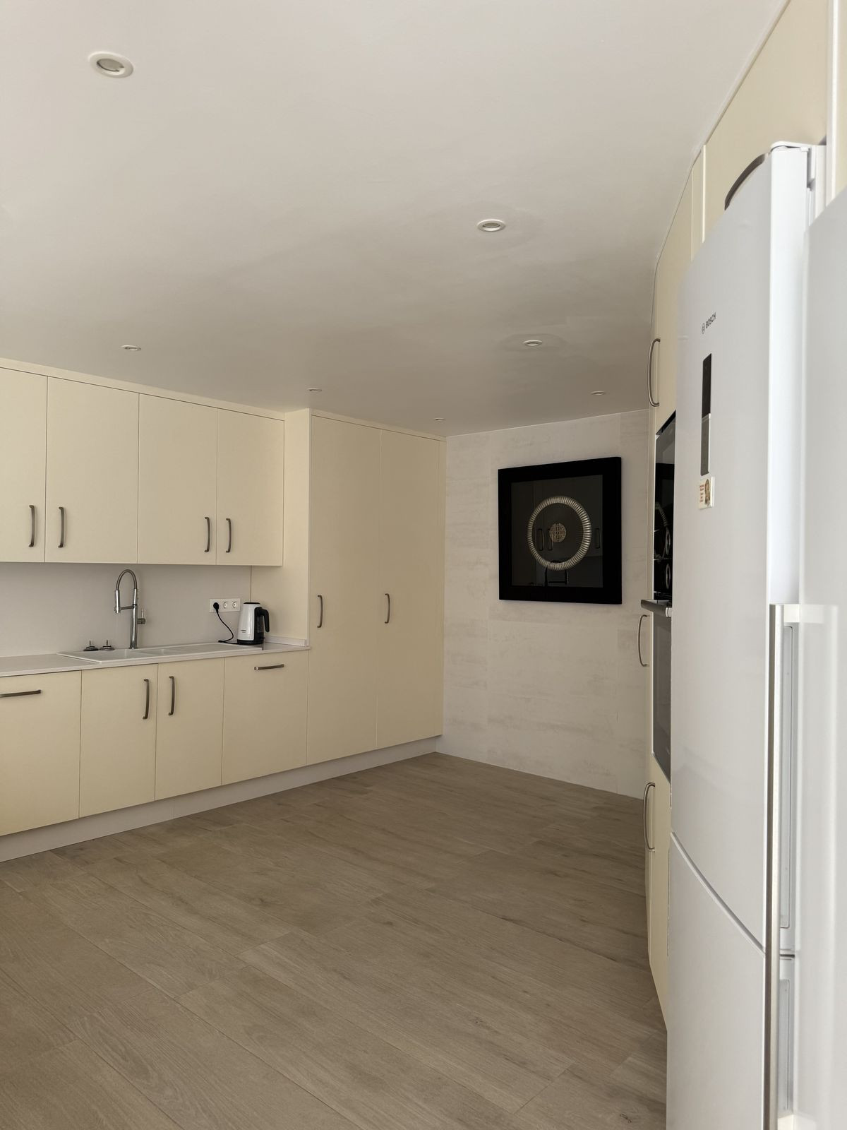 The large living room of approximately 50M2 has an open fire place, fully air-conditioned hot and cold throughout the house, large kitchen diner with a utility room, from the living room and kitchen you can access the wrap around terrace, and part of the terrace has been covered to give shade in the summer time. Again, you have sea views from the living room and terrace.