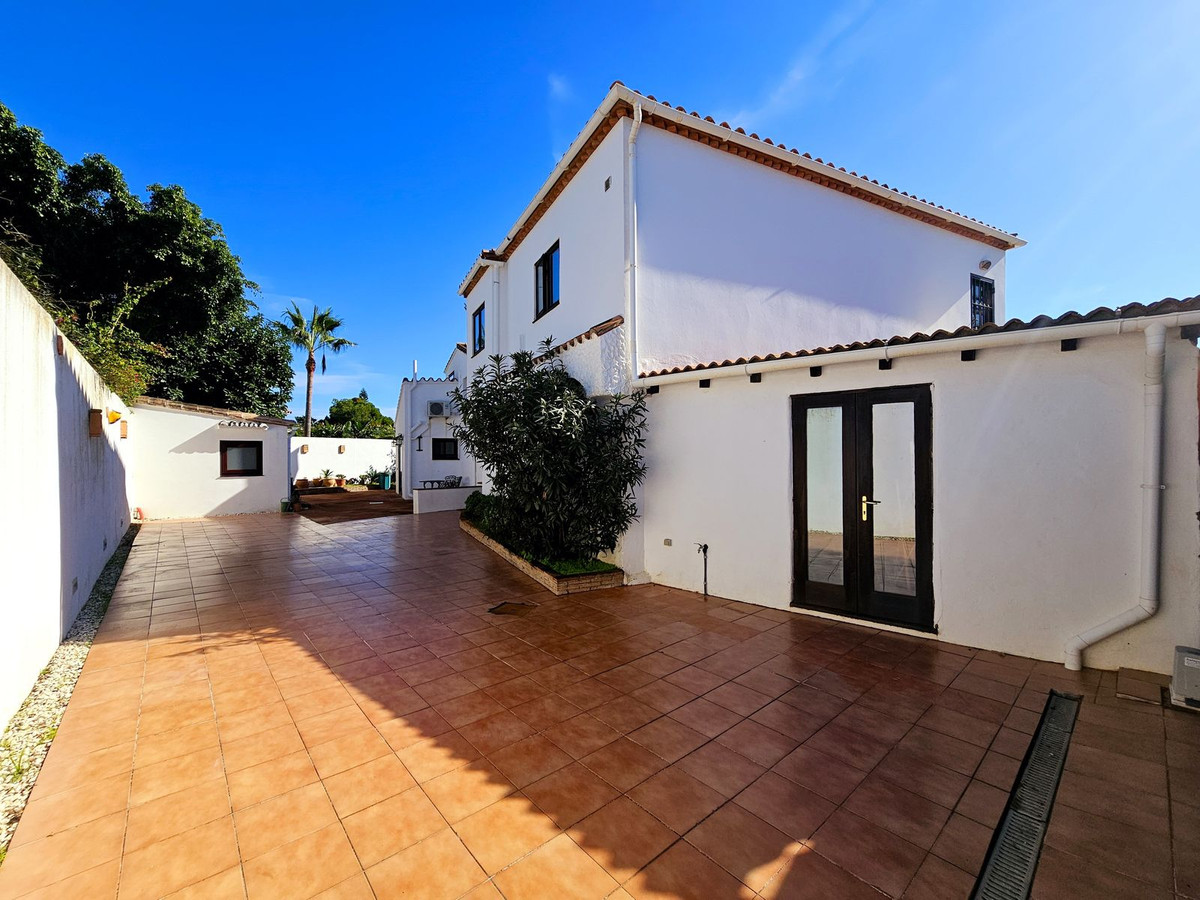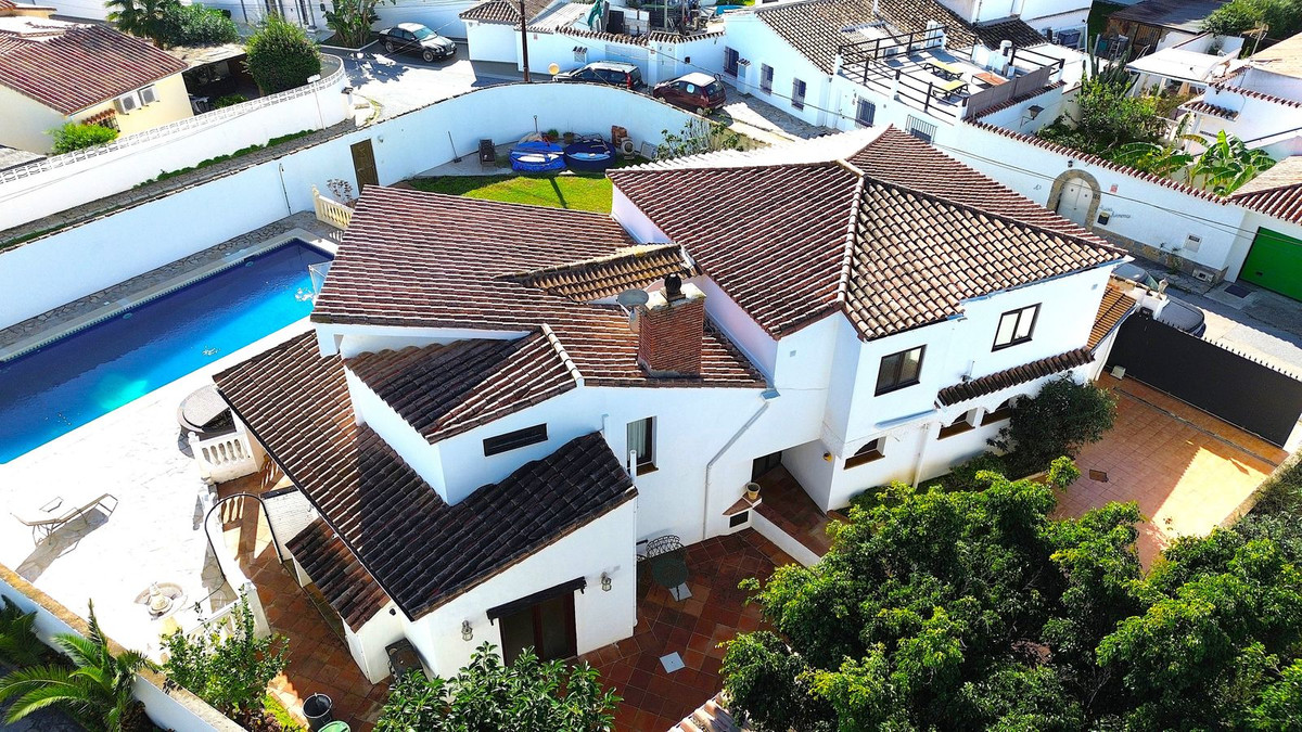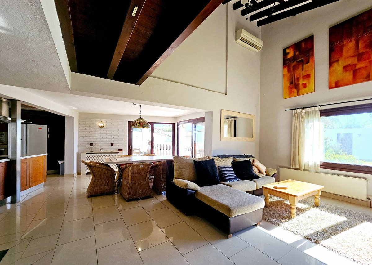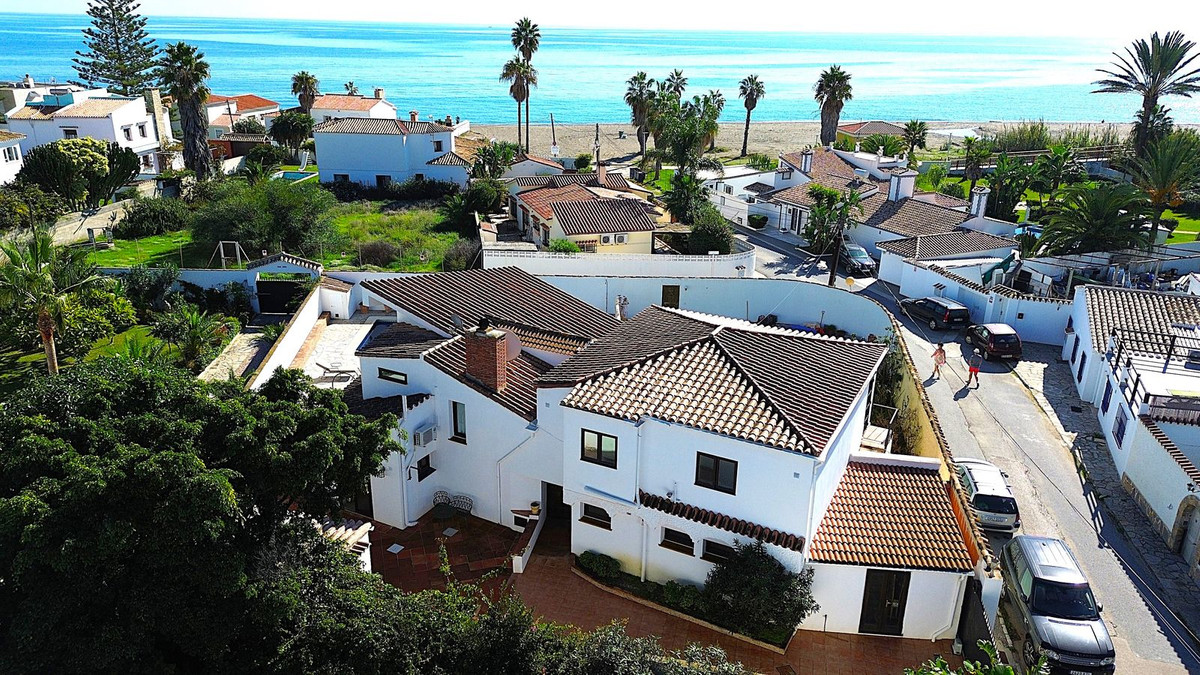 Priced at €1575000 : This beautiful villa is located just steps from the long sandy beach and the promenade that takes you into Estepona town. The house is south facing and is located second line from the beach on a large, flat plot. The main house has 5 bedrooms, 3 large refurbished bathrooms, 2 sitting rooms with 2 fireplaces, a large open plan kitchen, dining area, all spread over two floors. There is a further guest apartment with separate entrance that would be ideal for staff, teenagers or guests. The 851m² plot is completely flat making the garden area 100% useable. The garden houses an extremely large swimming pool and lawn area, which is perfect for a family with children or pets. The villa is accessed via automatic gates, with a secondary door at the bottom of the garden for closer access to the beach. This property has maintained its Andalucian charm with beautiful wooden beams, vaulted ceilings, and traditional tilework. On entering the villa you are greeted by a beautiful Andalucian wooden front door that opens up into an entrance hall. To the right you will find a spacious and bright living room, office, one large bedroom and a full bathroom. To the left there is a second sitting room/TV area, a fully equipped, open plan kitchen and dining area which leads straight out to the covered and uncovered terraces and garden. Upstairs you will find the large master bedroom with ensuite bathroom, private terrace and private access to the gardens. There are three further bedrooms upstairs, one with a private terrace. All are large and share an oversized bathroom with bath tub and shower. There is an undeveloped space between two of the bedrooms that could easily be adapted into a Jack and Jill bathroom if a further bathroom is needed. All bedrooms have hot and cold air conditioning, Walking distance from the house you have a beautiful sandy beach, 2 supermarkets, shops, a pharmacy, restaurants and bars. There are 5 golf courses within a 5 minute drive. Estepona town is less that 4 mins by car, La Duquesa port just over 5 mins by car, Marbella and Puerto Banus are 20 mins away. Malaga airport is 40 minutes by car with handy access to the AP7.