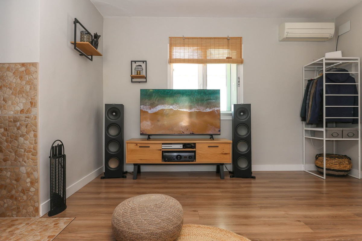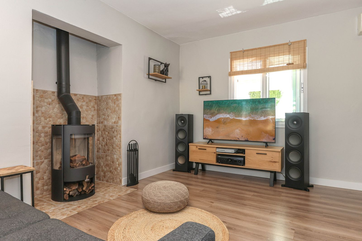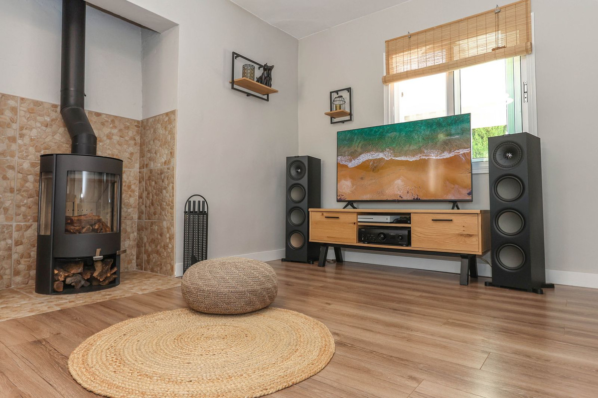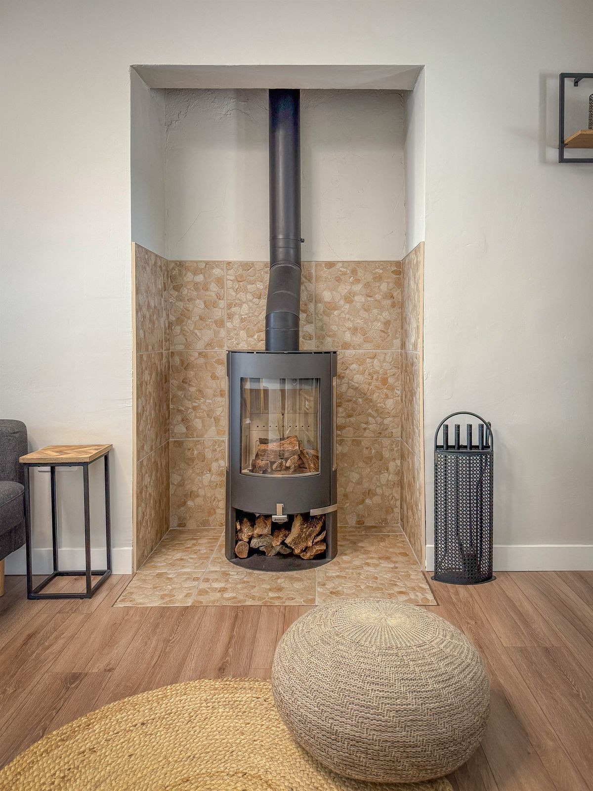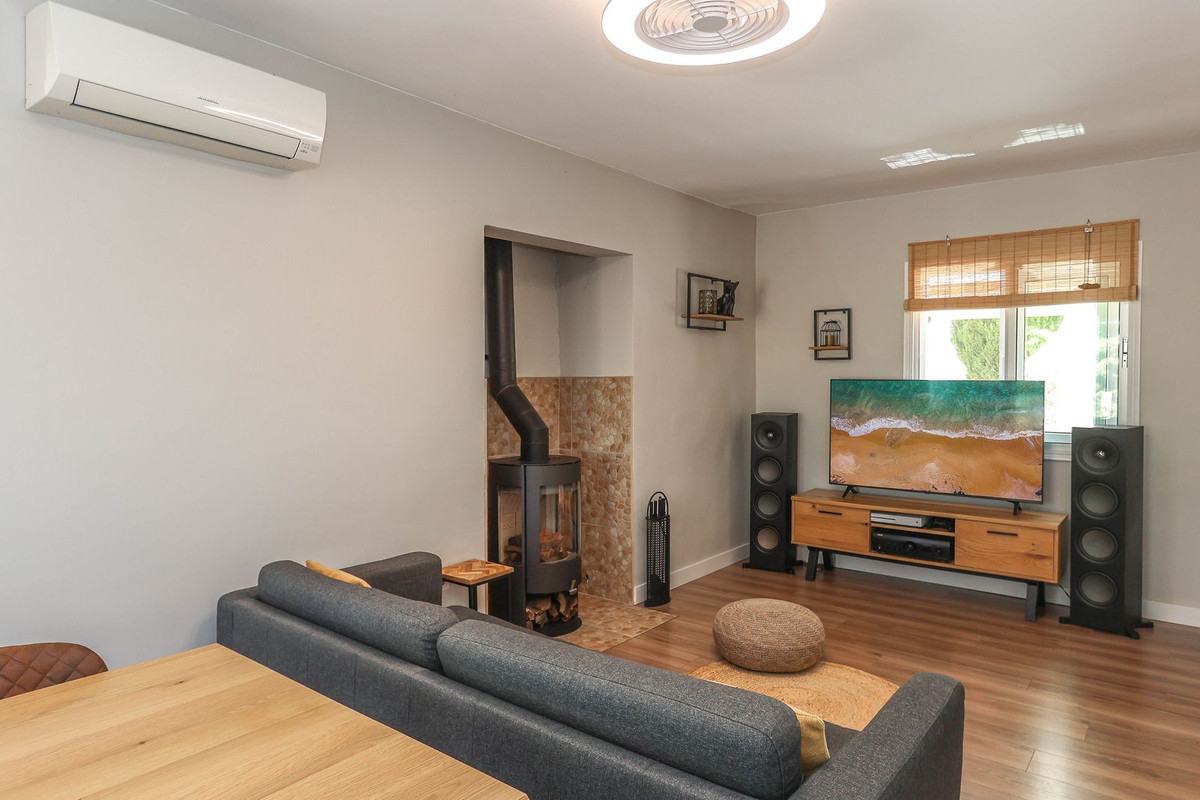 Step inside into a cozy yet modern lounge, complete with a stylish wood-burning stove for the cooler months. French doors open onto the side terrace and BBQ area, seamlessly blending indoor and outdoor living.