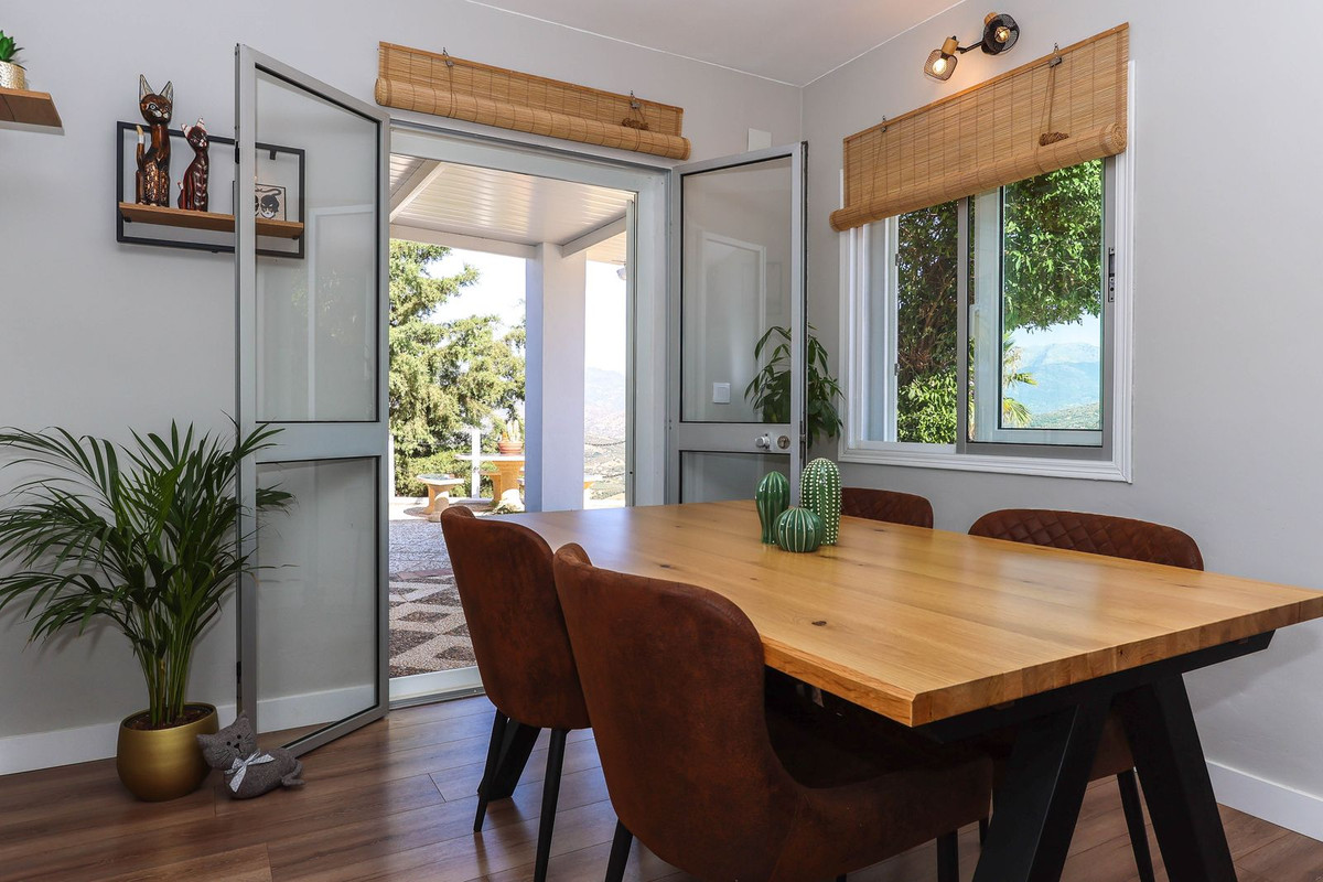 The kitchen is bright and welcoming, with a window overlooking the terrace and valley beyond.