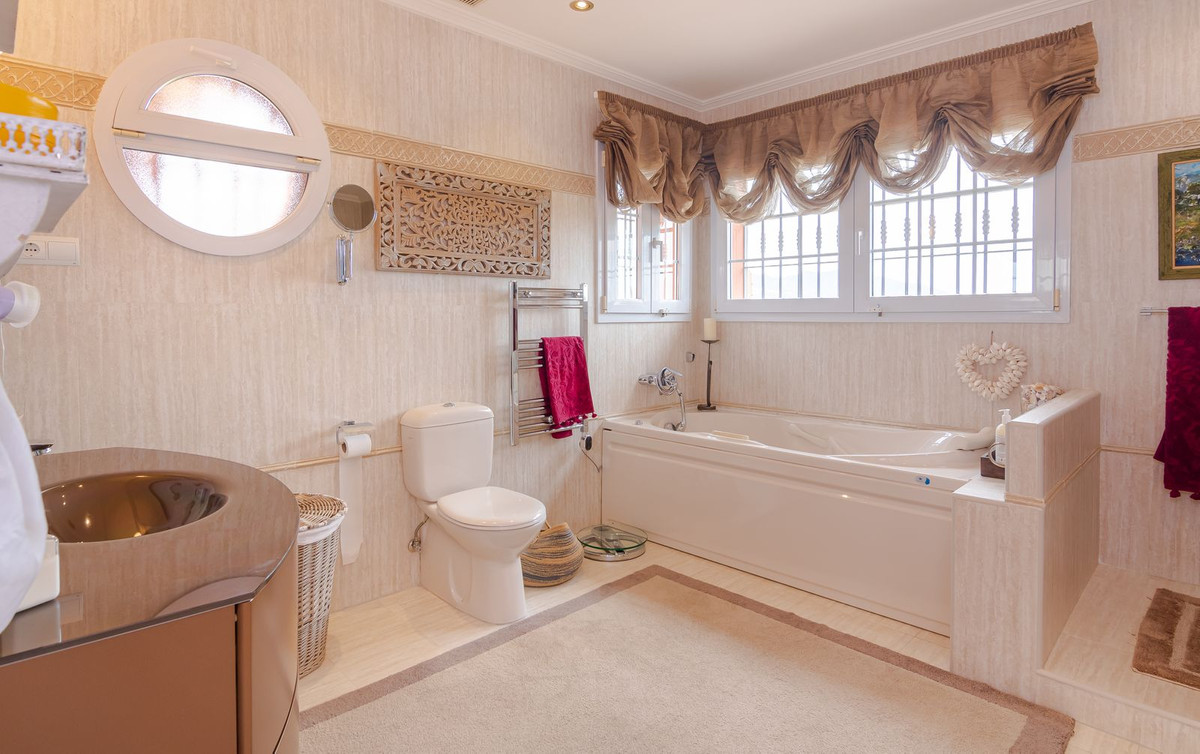 Andalusian style, immaculate property in great condition. 5 bedrooms, 4 bathrooms, 1 toilet, sauna, private infinity pool overlooking the sea. Very quiet and very private area to enjoy the tranquility and atmosphere of the area. The property consists of 623 m2 built on a 10,000m2 plot. 360º view of golf, mountains, sea and more.
