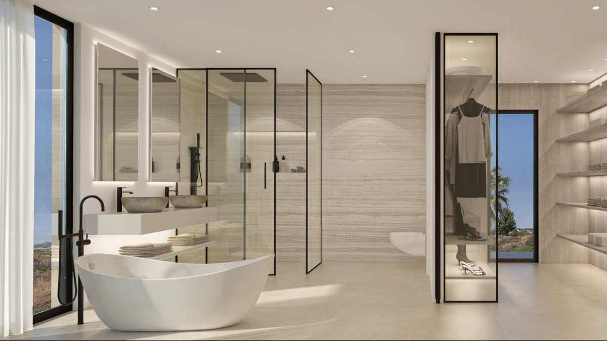 On the first floor there is a master bedroom with an en-suite bathroom and a spacious walk-in dressing room that has a spectacular terrace with views over the green hills of Mijas and the Mediterranean Sea. There is also an additional guest bedroom with an en-suite bathroom and a private terrace overlooking the sea.