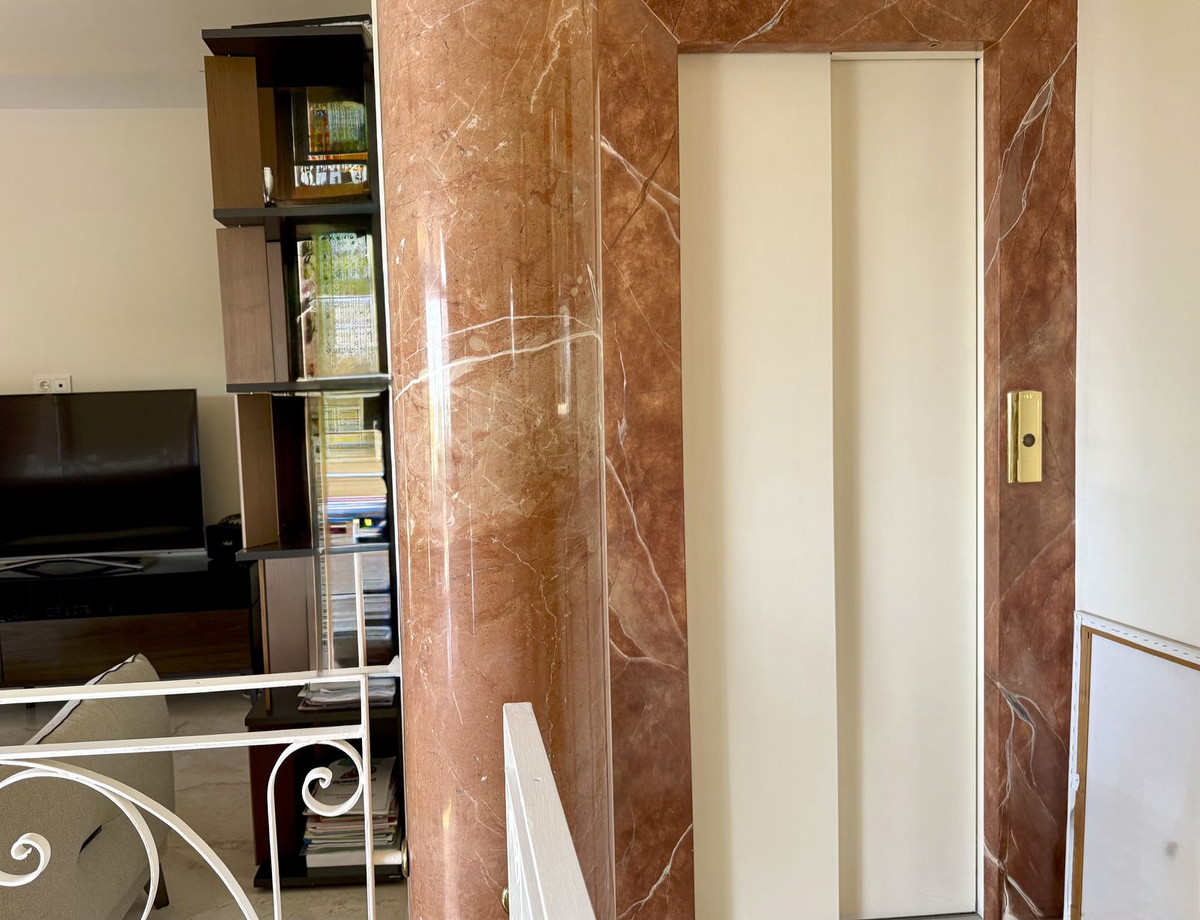 The main level features two spacious en-suite bedrooms, while the lower level offers an additional en-suite guest bedroom—perfect for visitors or extended family. A private LIFT connects all floors of the villa, offering seamless movement between living spaces and enhancing the home's sense of comfort and accessibility. This modern convenience, paired with a discreet professional sound system installed throughout the property, creates an atmosphere of effortless luxury.