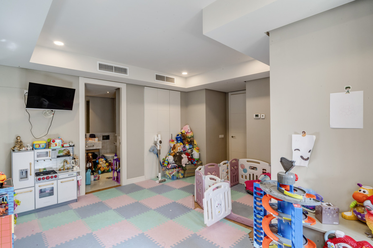 Magnificent five-bedroom, south-facing villa situated in the prestigious Village Las Lomas de Magna Marbella complex on Marbella's Golden Mile. The community offers 24-hour security service, two large community pools, and lush tropical gardens of exceptional beauty. The villa enjoys a prime location, close to all amenities, including supermarkets, shops, restaurants, schools, and golf courses, and is only a five-minute drive from the sea. The property is distributed over three floors; the main floor features a spacious entrance hall; a living room with direct access to the terrace; a fully fitted kitchen; dining area; guest bedroom with an en-suite bathroom; and a guest toilet. The lower floor comprises of the master suite with a walk-in closet and access to the terrace; three guest suites; laundry room; and access to the double garage. The upper-level leads to the spacious solarium with jacuzzi and stunning sea and mountain views. Additional features include hot and cold air conditioning, underfloor heating, an elevator connecting all levels, and a private garage for two cars.