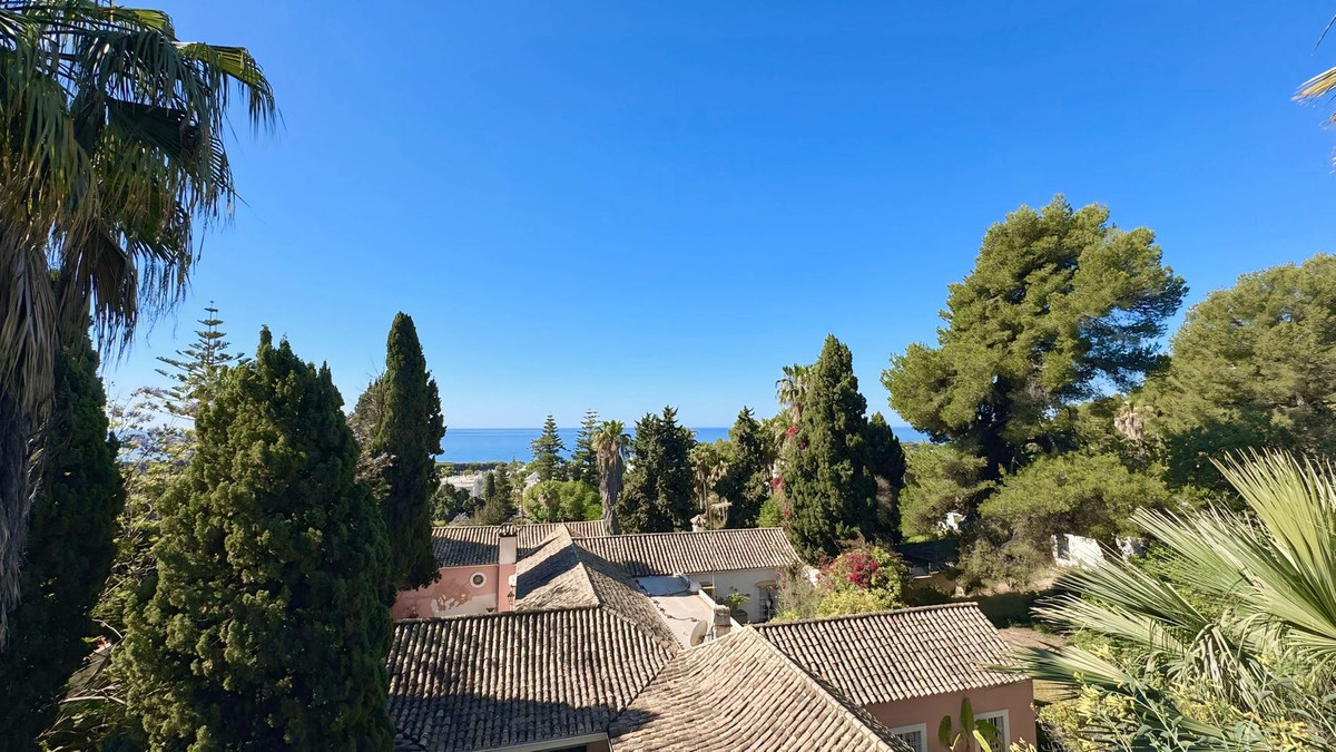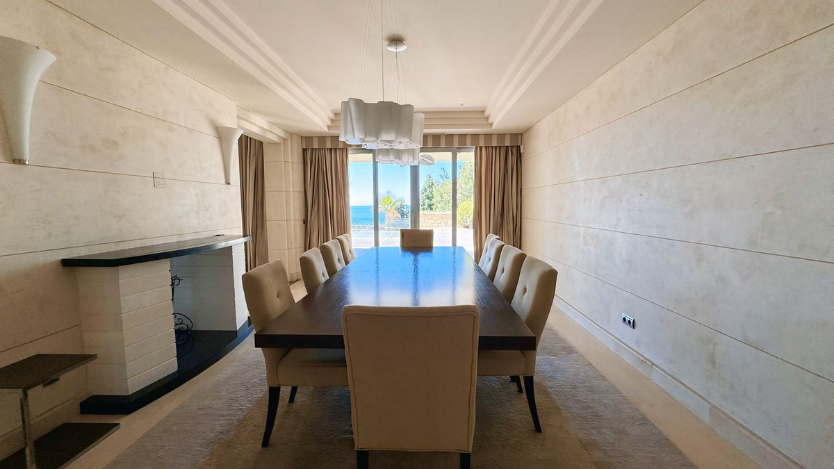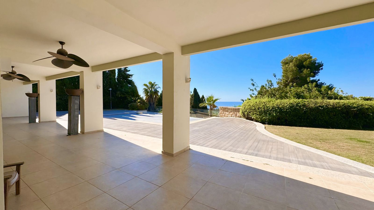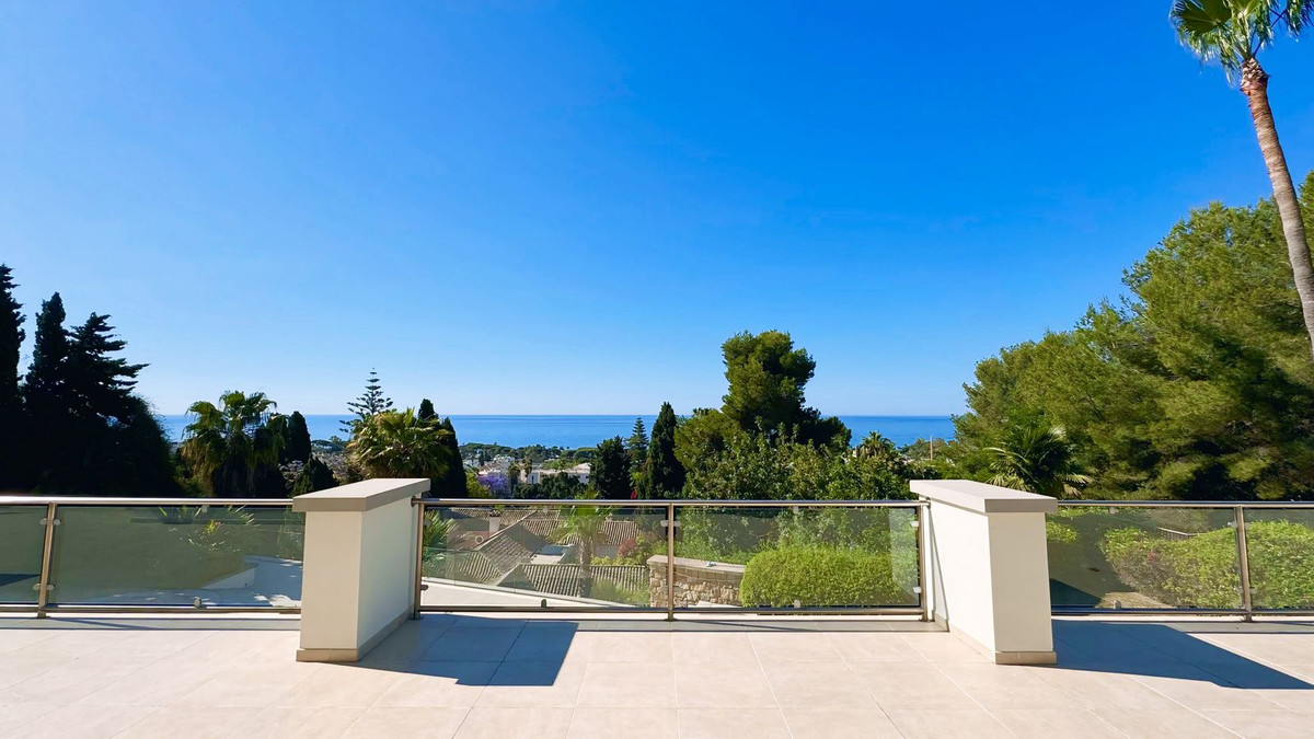 This substantial property is set in a privileged position within walking distance of the beach and all amenities, offering a high level of privacy being accessed via a private cul-de-sac. There is a private driveway with parking and a garage. The impressive double height entrance hall features a unique double staircase leading to a spacious living room with excellent sea views and access to the covered terrace. Adjoining the living room is a formal spacious dining area leading to a large open plan area including the kitchen, a breakfast dining area and a further living area with fireplace. There are impressive sea views from the dining room and kitchen/living areas with access to the main terrace. Also on this level is a guest cloakroom, lift access to the first floor and basement and 3 large en-suite bedrooms, ample fitted wardrobes and one with excellent sea views.